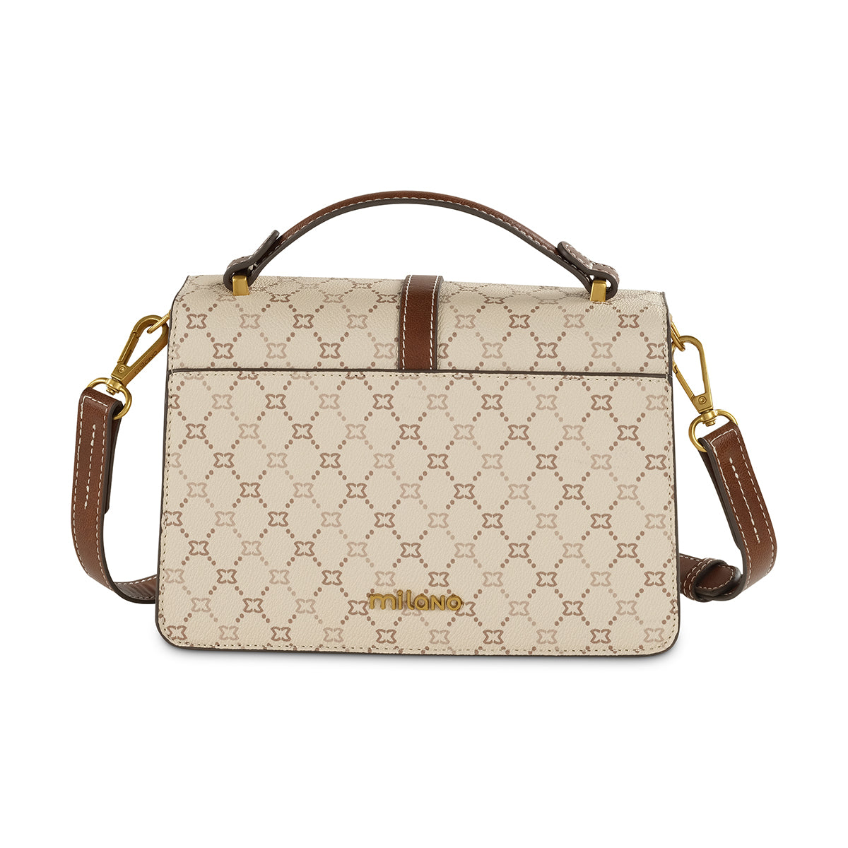 Elevate your look with our elegant beige monogram top handle satchel bag. It features a sophisticated contrast tan front strap closure, highlighted by striking contrast stitching and eye-catching hardware. With a long, detachable shoulder strap for versatile wear and convenient internal pockets, this satchel is designed for both style and everyday practicality.