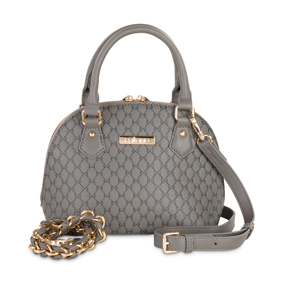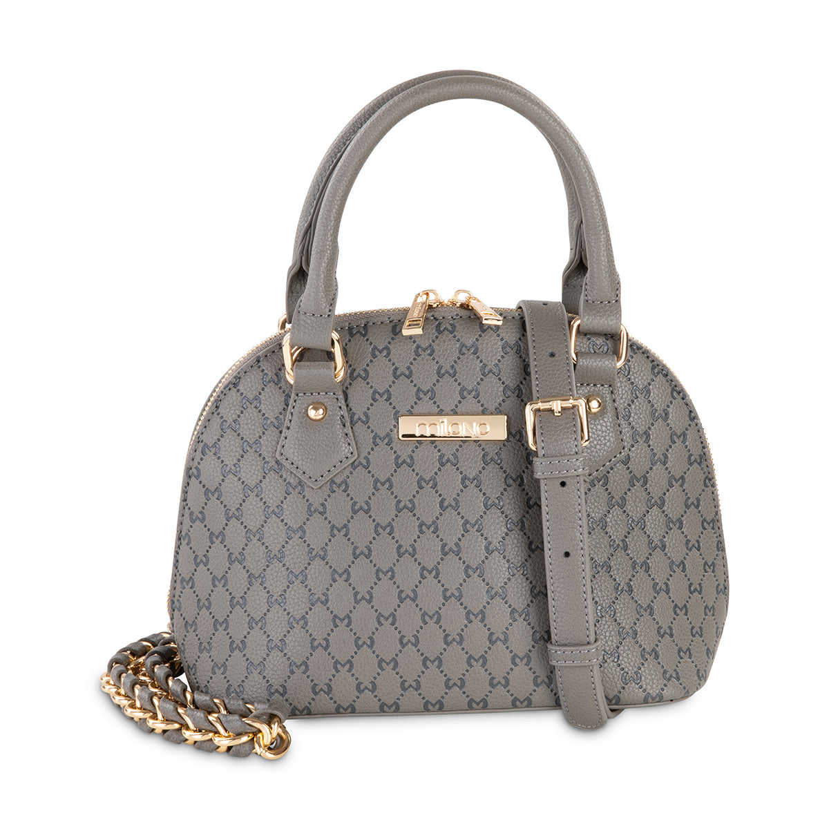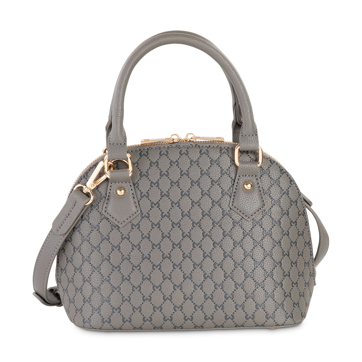 This sophisticated gray handbag features a subtle, repeating geometric pattern, adding a touch of texture to its classic dome silhouette. The polished gold-tone hardware, including a distinctive front plaque and a statement chain detail, elevates the design. With dual handles and an optional shoulder strap, it offers versatile carrying options for everyday elegance.