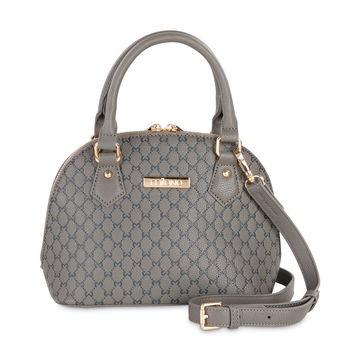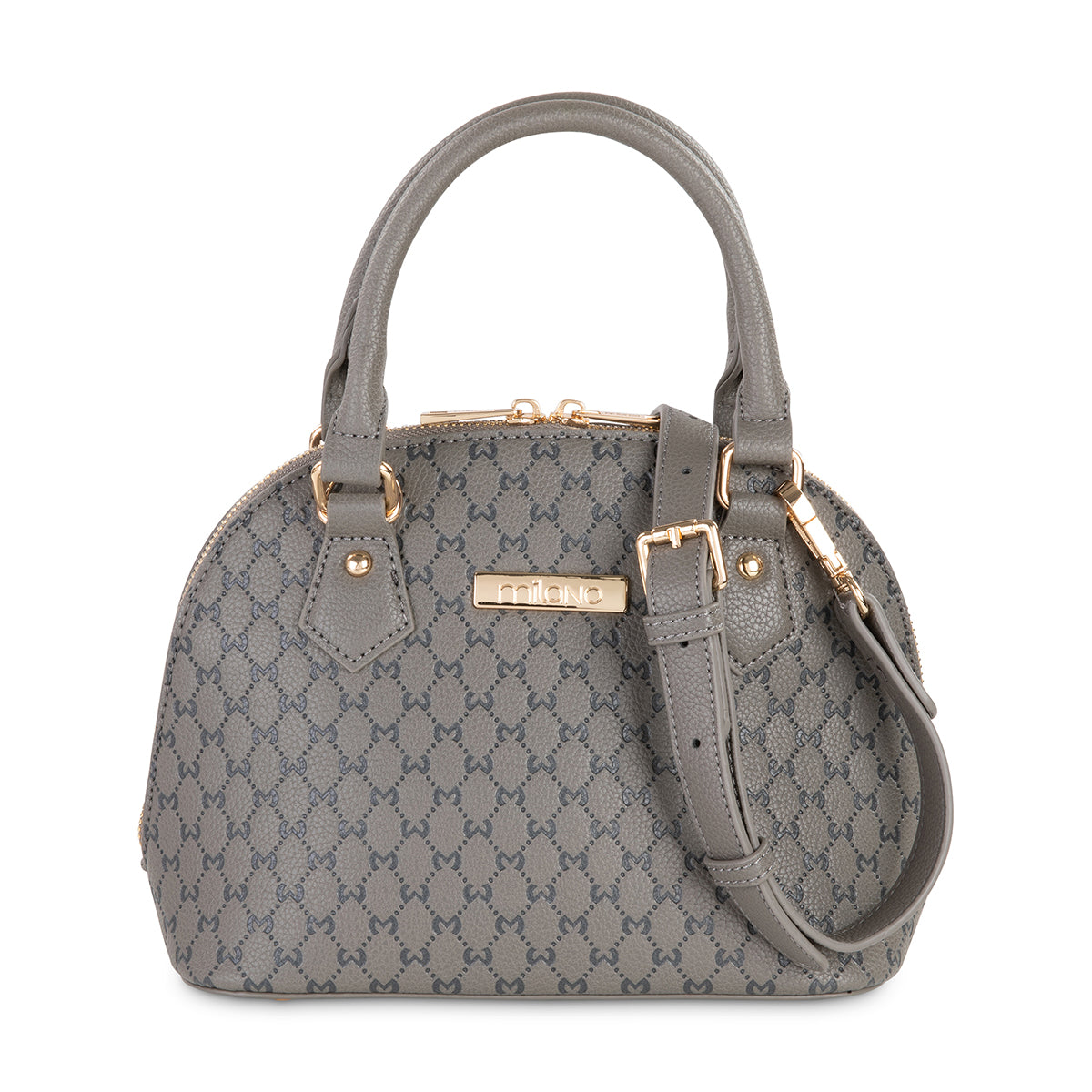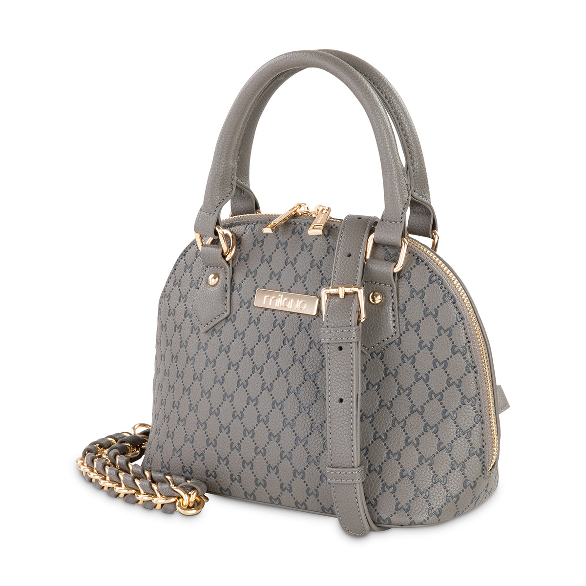 This sophisticated gray handbag features a subtle, repeating geometric pattern, adding a touch of texture to its classic dome silhouette. The polished gold-tone hardware, including a distinctive front plaque and a statement chain detail, elevates the design. With dual handles and an optional shoulder strap, it offers versatile carrying options for everyday elegance.