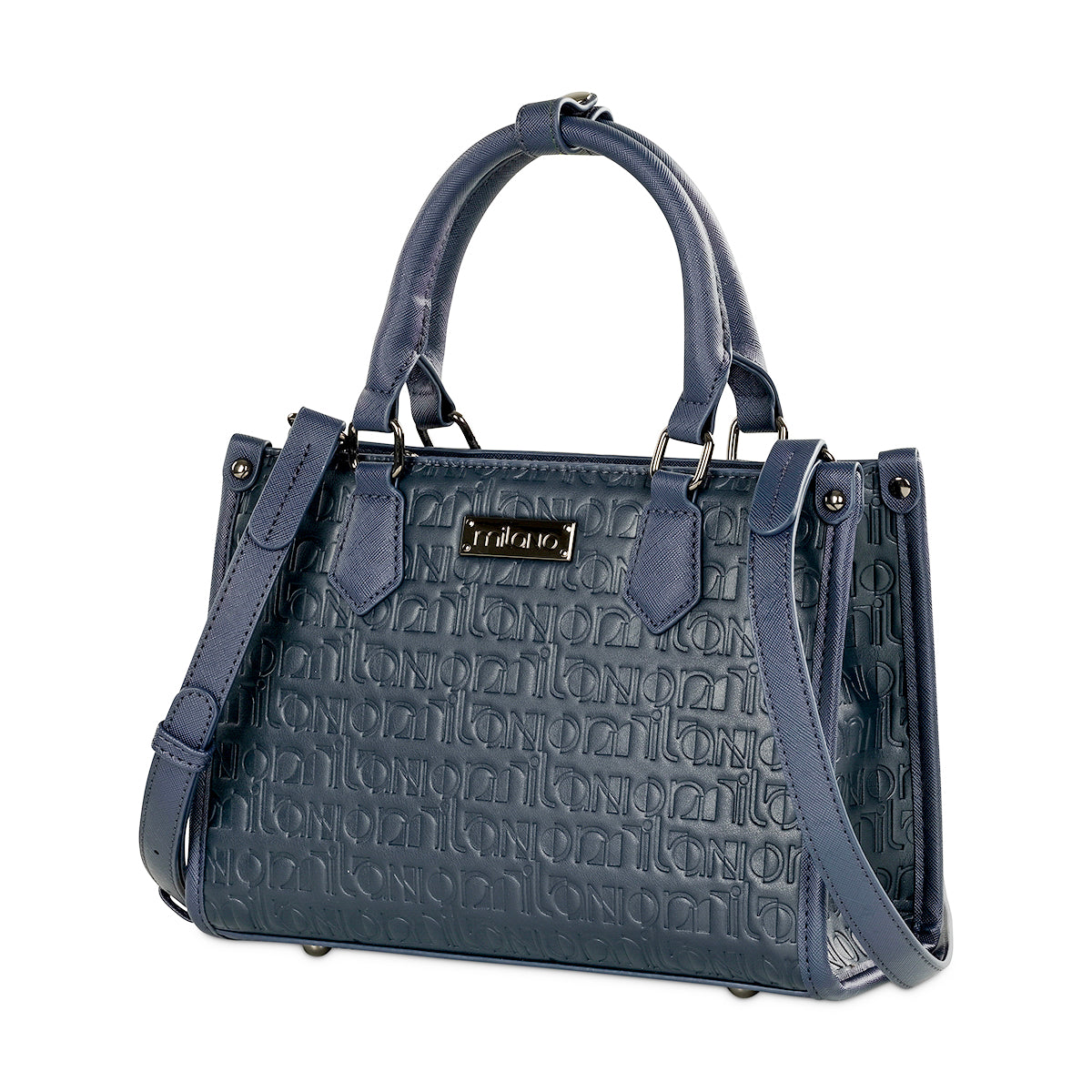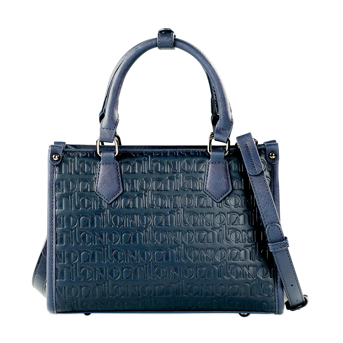 Introducing the MALAIKA Mini Tote in elegant navy blue. This structured bag features a sophisticated all-over monogram print, complemented by sleek top handles. With its secure top zip closure and versatile detachable shoulder strap, this compact tote is perfect for adding a refined touch to any outfit, from day to evening.