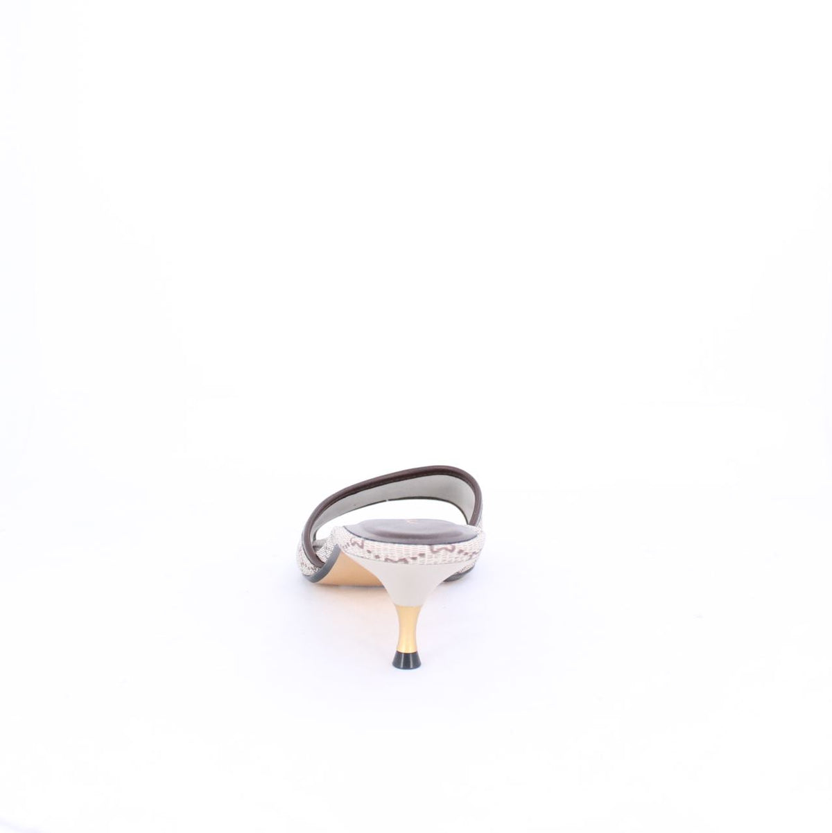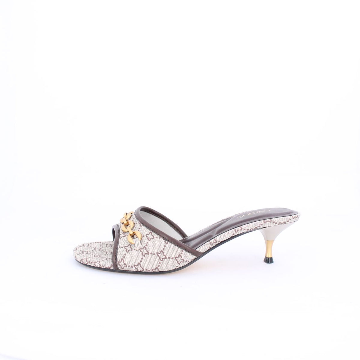 Elevate your style with these iconic Milano MM printed Mules. The rich brown leather-like trim and a subtle gold-tone chaind etail across the vamp add a touch of classic elegance. Set on a comfortable low kitten heel, with gold-tone sole perfect for adding a sophisticated touch to your everyday or more refined looks. It comes with a matching bag for a coordinated look.