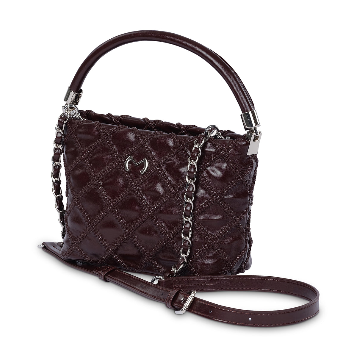 Meet your new go-to accessory: the 'Himari Mini' structured handbag. Crafted from a luxurious, dark brown material, this bag features a beautifully quilted design and sleek silver-tone hardware. Its elegant top handle and detachable chain strap offer both classic charm and modern versatility, making it an essential piece for any occasion.