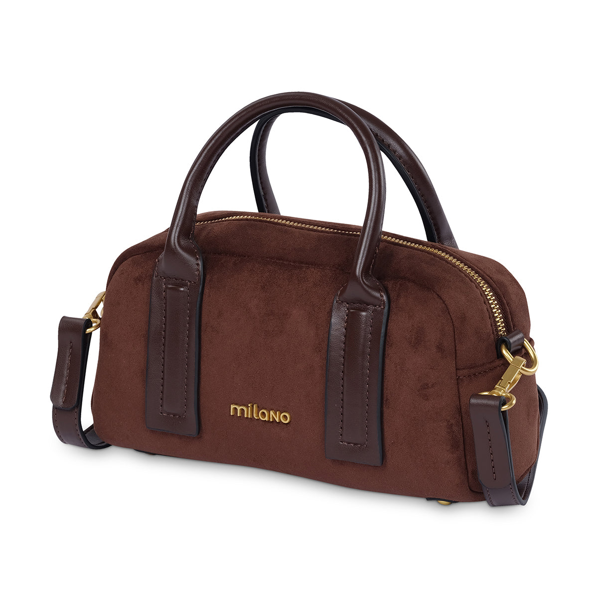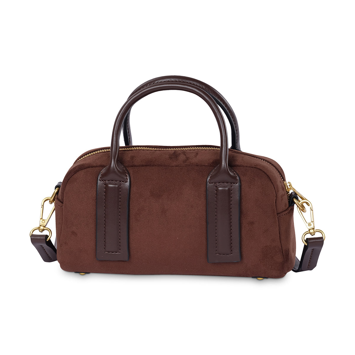 Add a touch of polished elegance to your look with the Lisha bowling bag. Crafted from a soft, suede-like material in a rich brown tone, this bag features a classic silhouette and contrast trim. A secure zip-top closure and polished gold-tone hardware make it a timeless choice for any occasion.