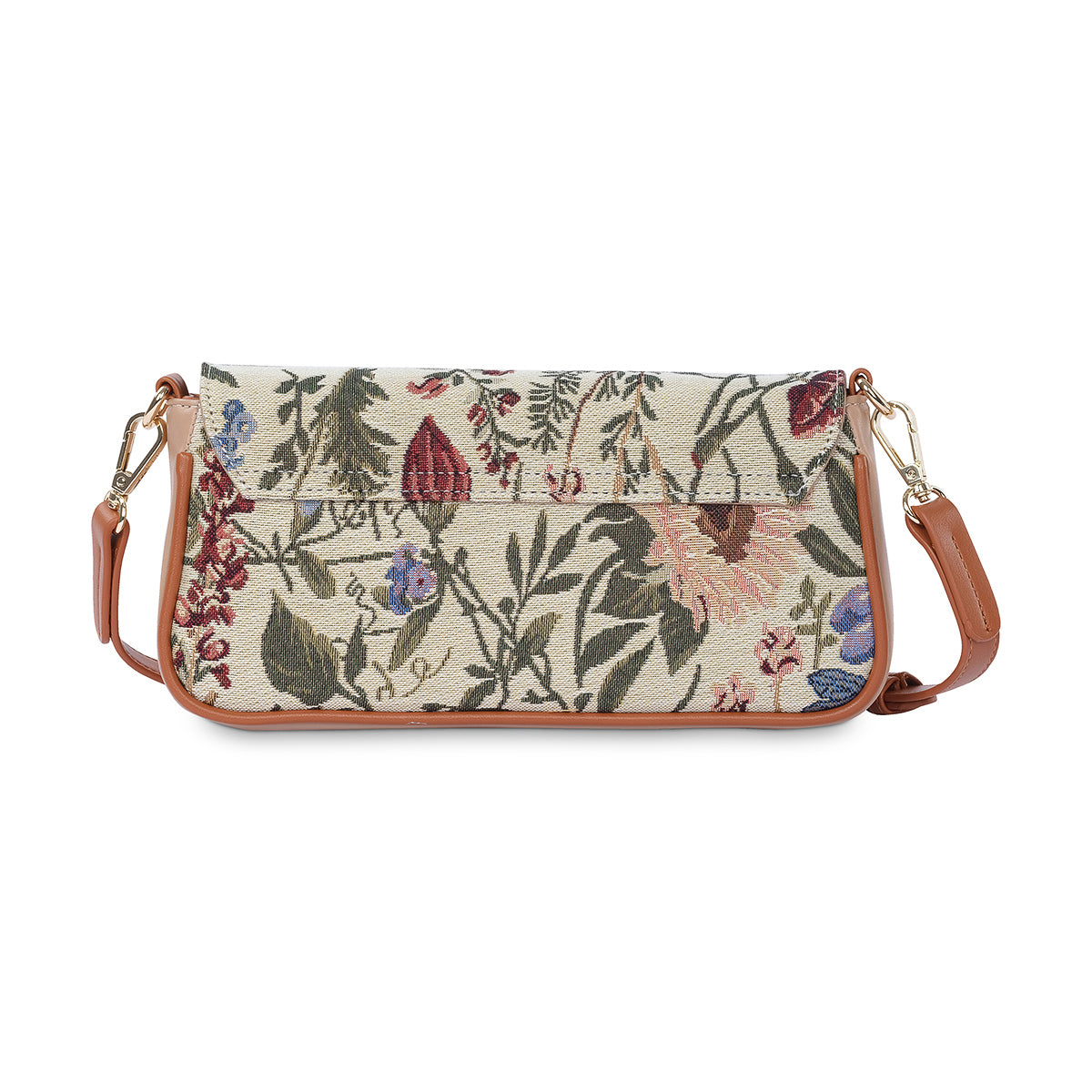 Add a touch of nature-inspired elegance to your look with the 'Julie' flap bag. This charming bag features a delicate floral print on a light background, accented by warm brown trim and a sleek gold-tone clasp. Its compact size and versatile design make it perfect for both casual outings and special occasions