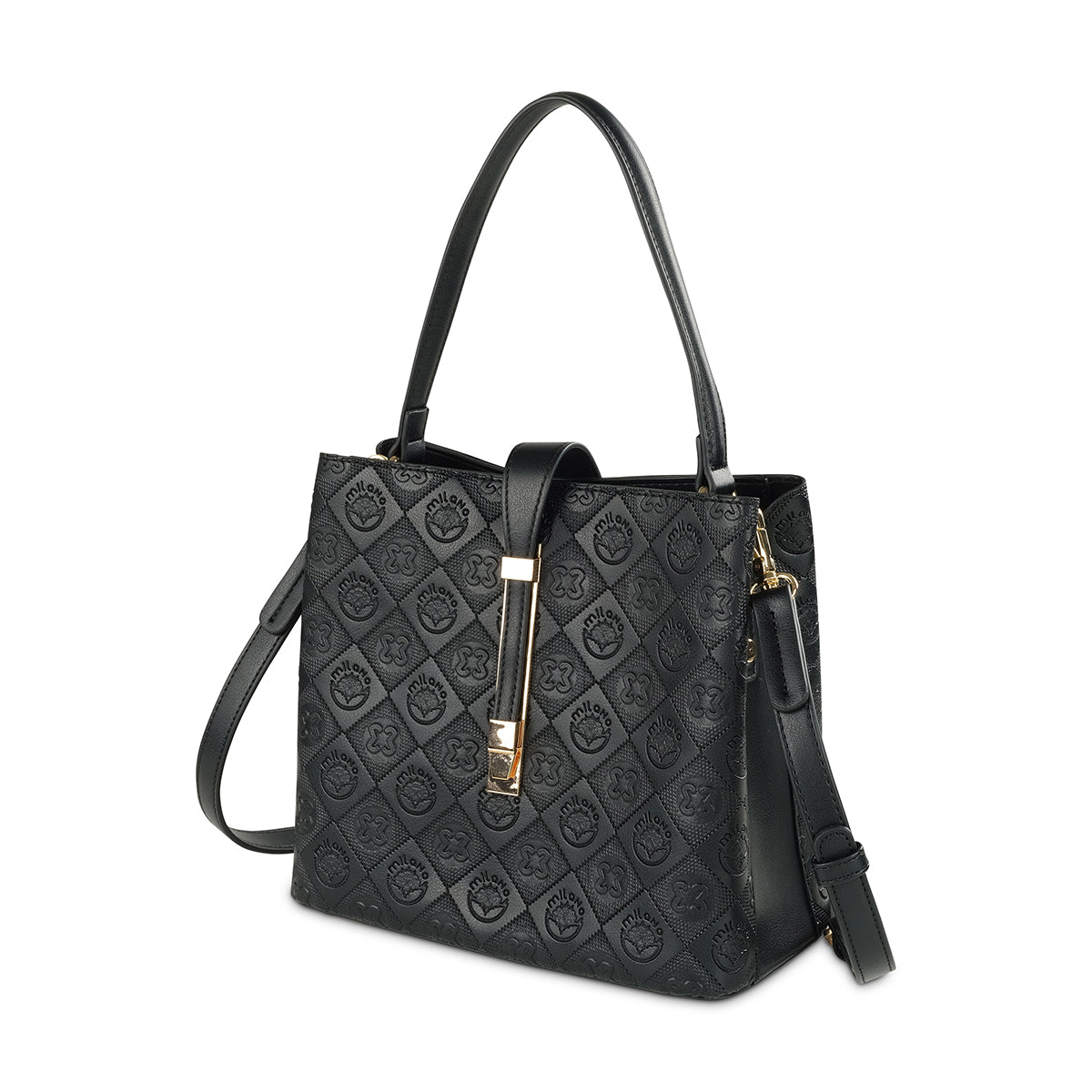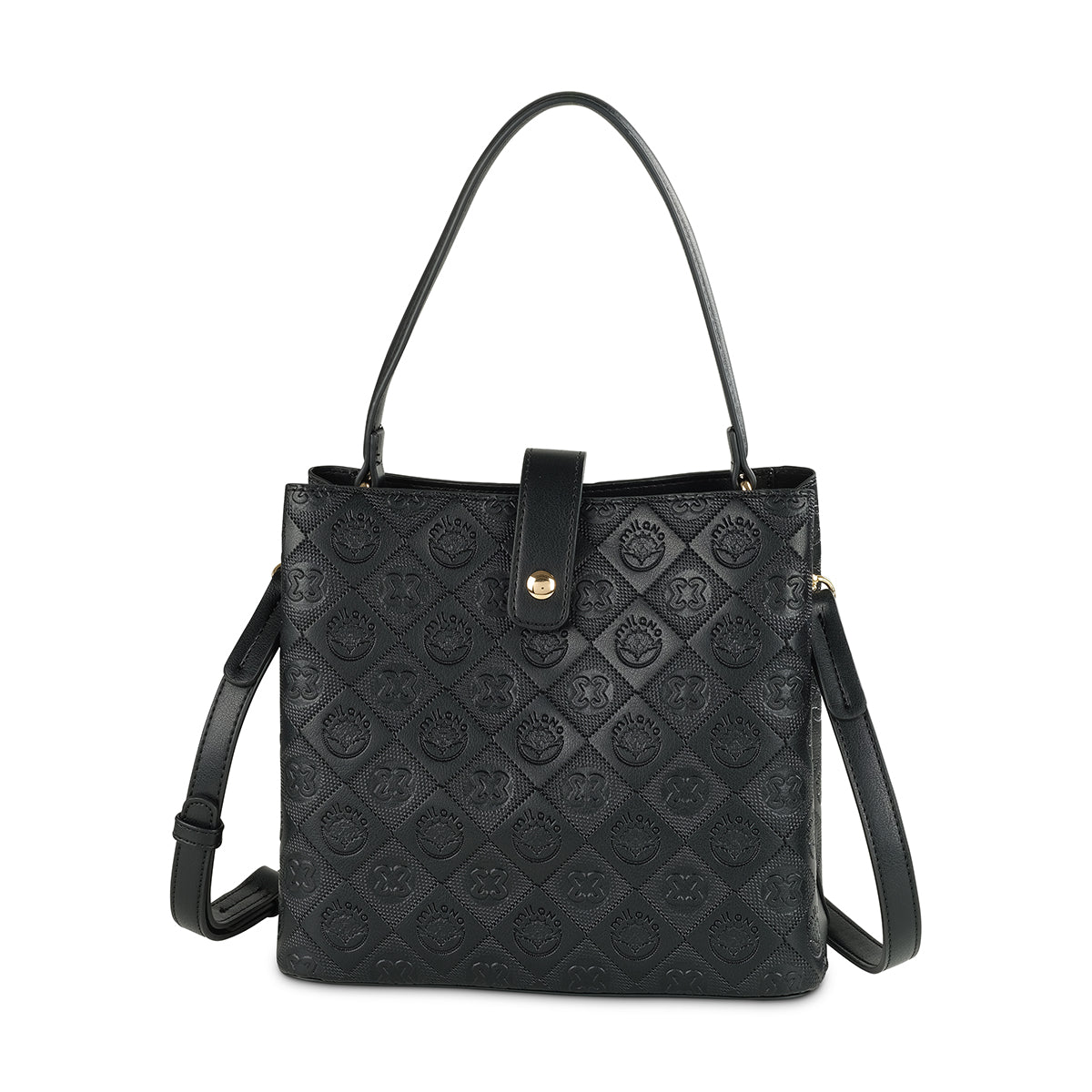 Discover modern elegance with our structured black bucket bag. Its unique patterned body is complemented by a sleek top handle and a distinctive gold-tone strap detail. With a versatile detachable strap, this bag is a chic and functional choice for any occasion.