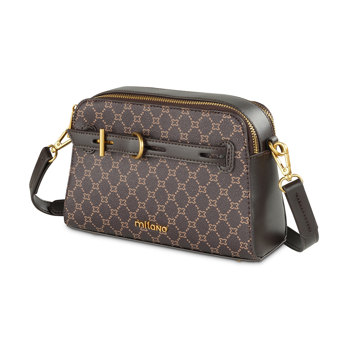 This Brown Milano crossbody bag has twin compartments to suit your everyday needs. Showcasing our signature MM logo, Milano trim and incorporating the belted detail seen on the catwalks this season. Comes with an adjustable long strap.