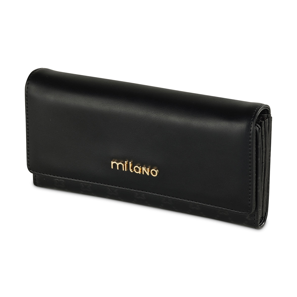 Keep your essentials organized in sleek style with our black long wallet. Crafted from a smooth, premium material, this classic design features a convenient flap closure adorned with a distinctive metallic "Milano" logo. Inside, find ample space for cards, cash, and coins, making it an everyday essential.