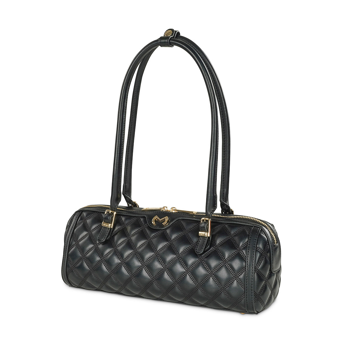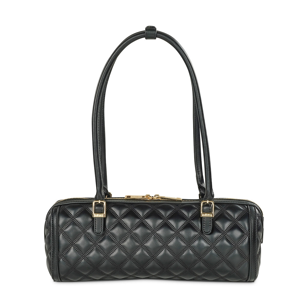 Discover unique elegance with our black quilted barrel bag. Its distinctive elongated shape and luxurious diamond quilting make a chic statement. Featuring comfortable top handles and gleaming gold-tone hardware, this bag seamlessly blends sophisticated style with practical design for your everyday essentials.