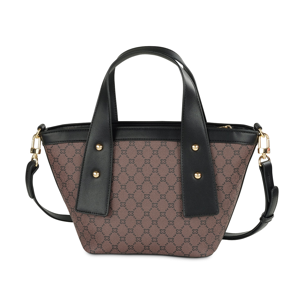 Discover unique sophistication with our trapezoidal tote bag, featuring a classic brown monogram print accented by sleek black handles and trim. Its distinctive flared silhouette and polished "Milano" logo make it a stylish statement. Complete with a versatile detachable strap, this bag is perfect for chic everyday carry.