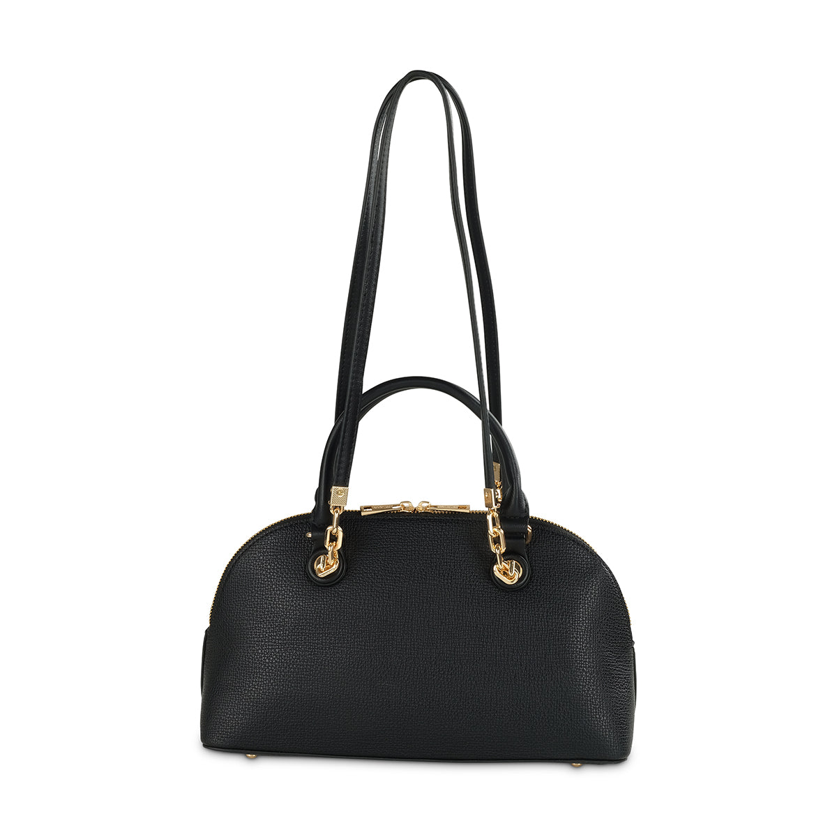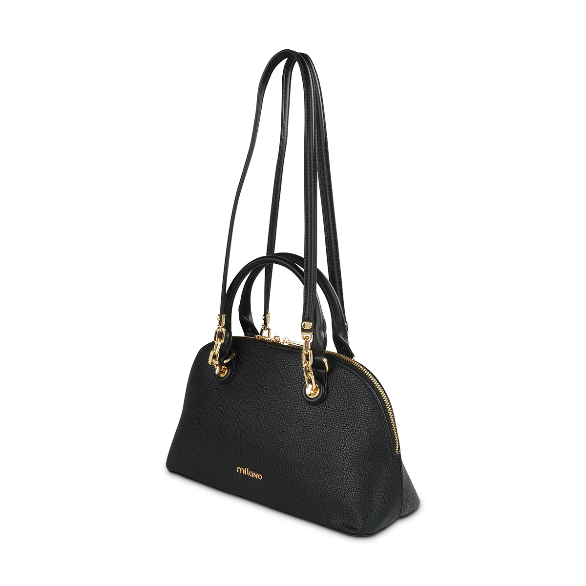 Discover timeless elegance with our structured dome bag in a sophisticated navy blue. Crafted from a smooth, refined material, this classic silhouette features chic gold-tone chain-link handle details and a prominent "Milano" logo. Complete with a secure top zip and a versatile detachable strap, it's the perfect accessory for a polished look.
