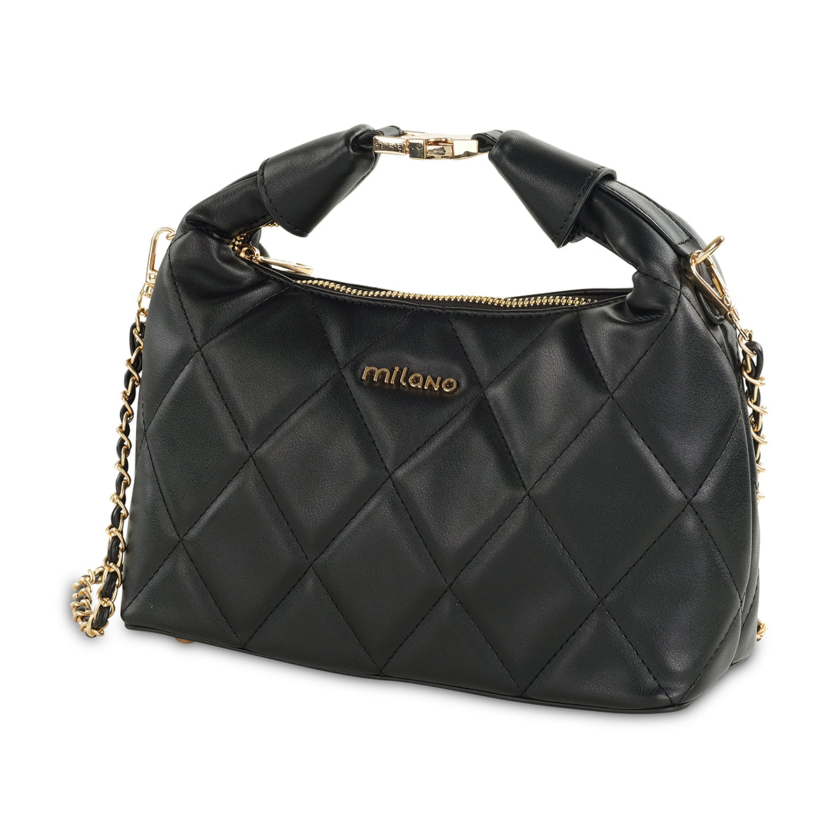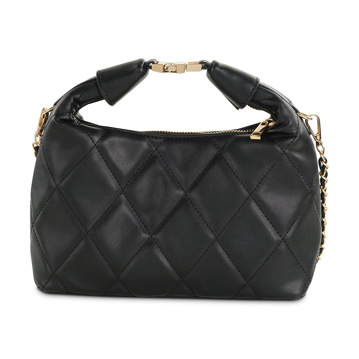 Discover effortless elegance with our black quilted shoulder bag. Its soft, modern silhouette features luxurious diamond quilting and a unique, artfully gathered top handle with gold-tone accents. The versatile design includes a stylish chain-detail shoulder strap and a secure zip closure, making it a chic companion for any occasion.
