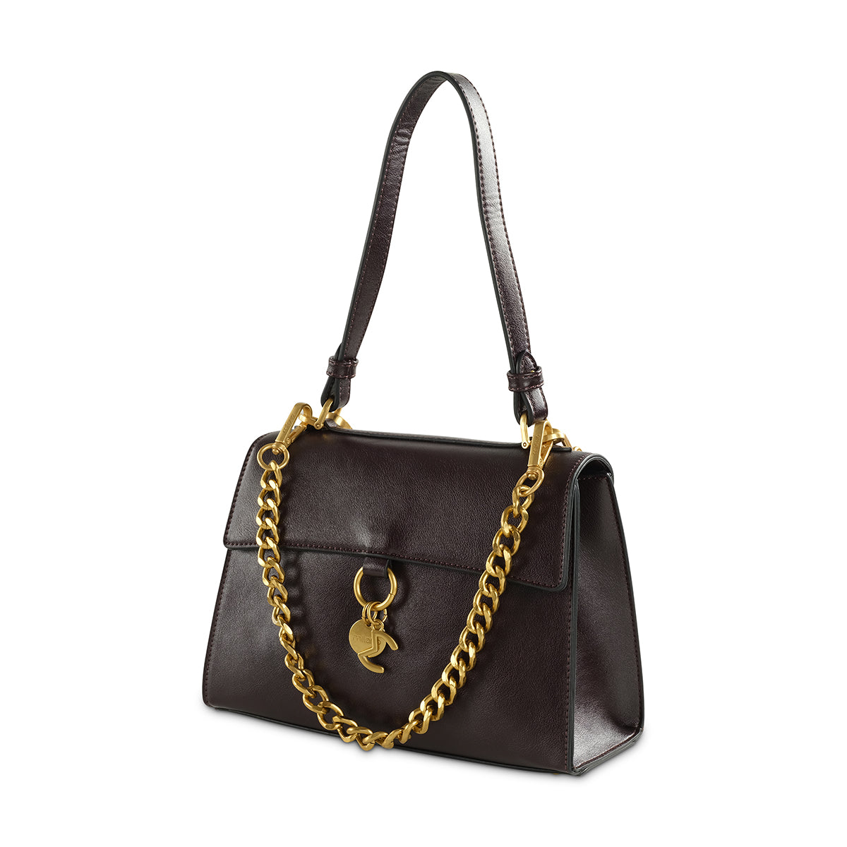 Elevate your look with this sophisticated black top-handle bag. Crafted from a smooth, structured material, it features a timeless flap closure accentuated by striking gold-tone hardware. Its classic silhouette makes it a perfect accessory for any refined occasion.