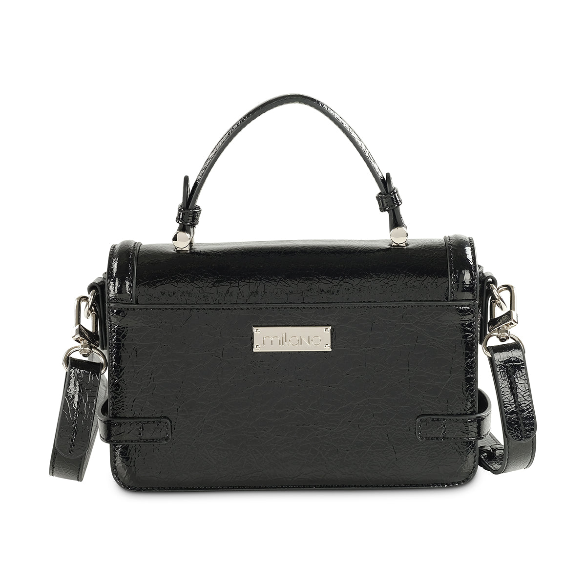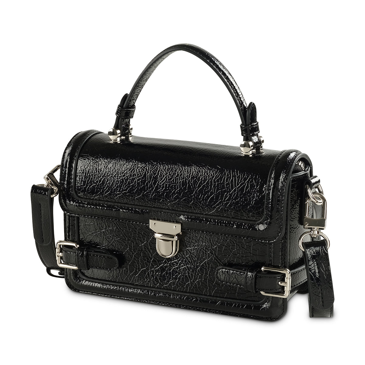 Make a bold statement with our sleek black patent structured bag. Its high-shine finish and classic satchel silhouette exude sophisticated edge. Featuring a prominent silver-tone clasp and chic buckle details on the front, along with a versatile detachable strap, this bag is perfect for those who dare to stand out.