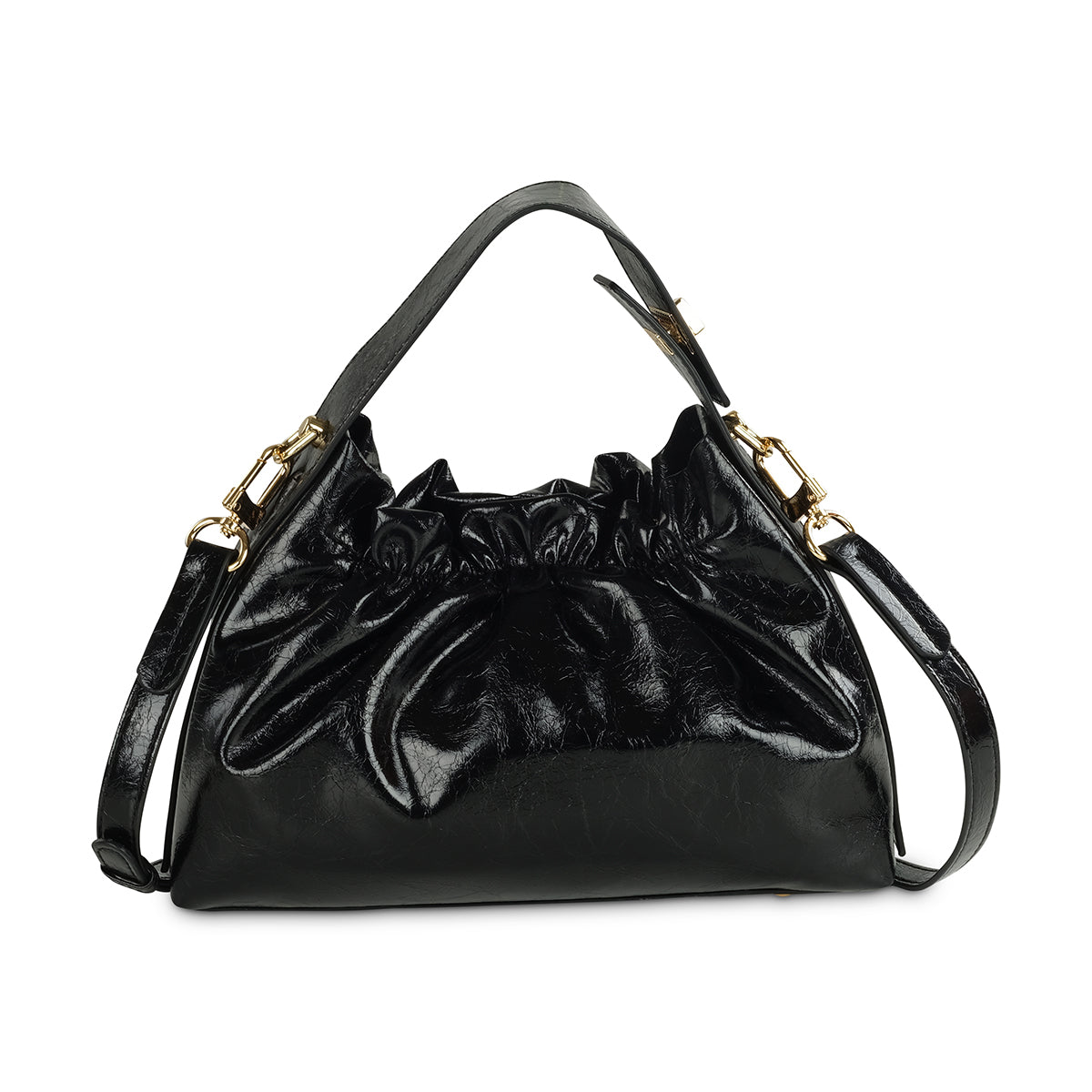 Elevate your style with our chic black patent gathered bag. Its high-shine finish and unique cinched top create a modern, luxurious look, complemented by a subtle metallic "Milano" logo. Featuring a comfortable top handle and a structured base, this bag is a stylish statement piece for any occasion.
