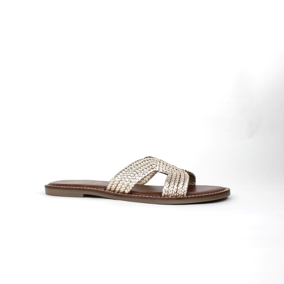 Crafted with a stylish braided leather strap across the foot, these easy slip-on flats are perfect for warm-weather days. The simple yet elegant silhouette makes them a versatile choice for beach outings, poolside lounging, or casual strolls.