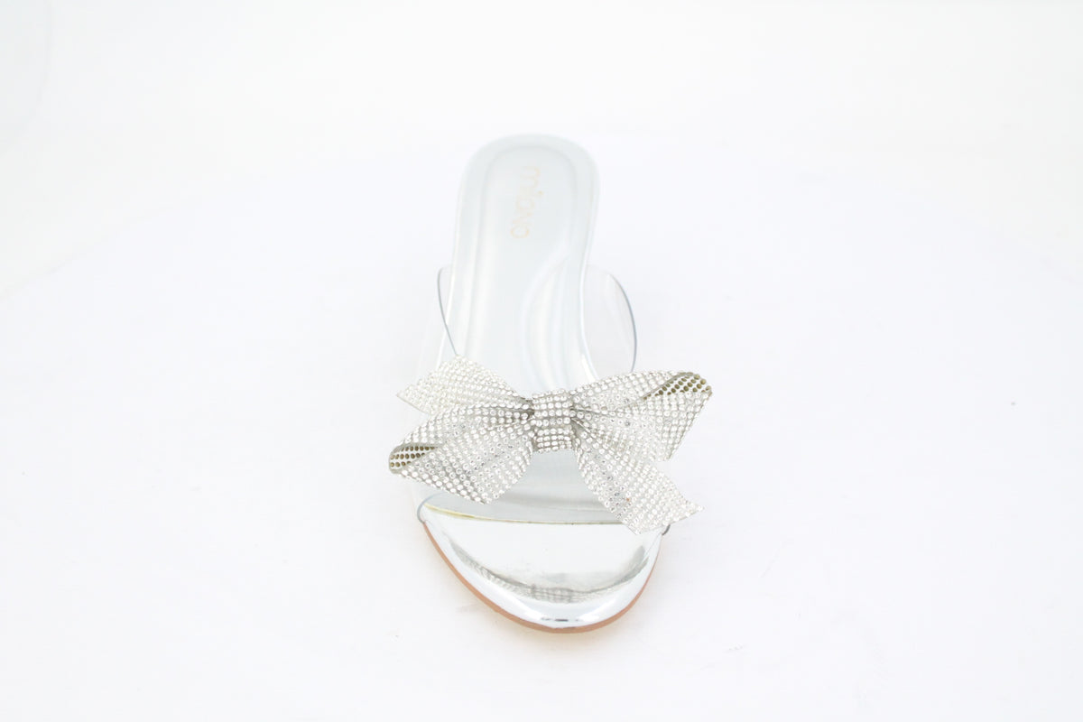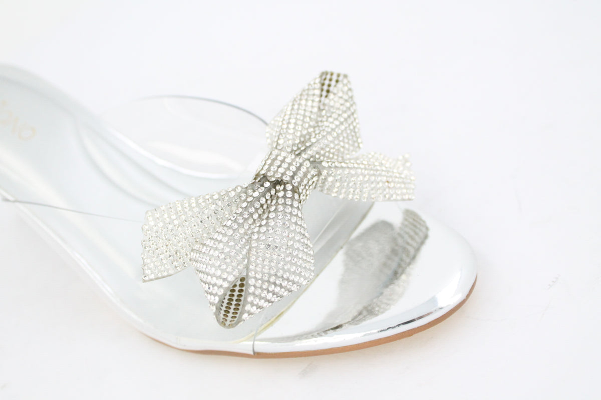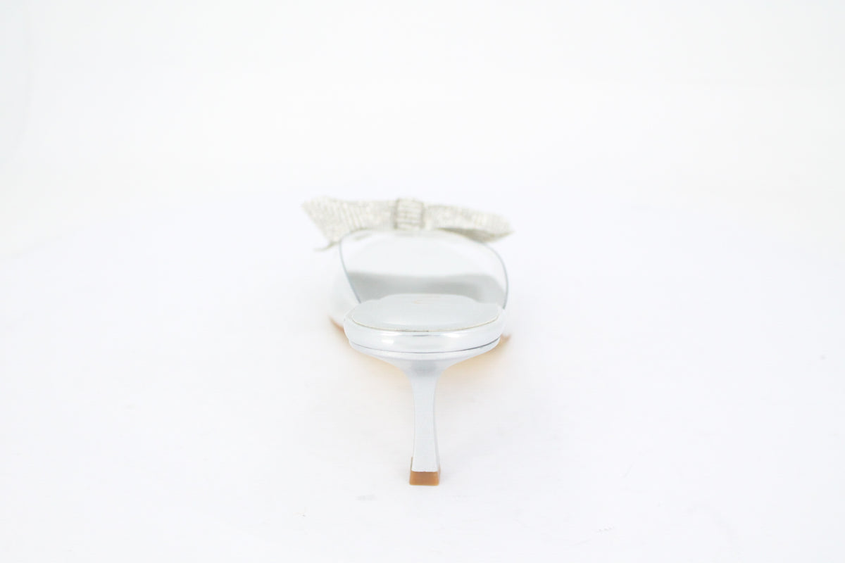 The Gabella mules present a harmonious blend of contemporary design and refined detail. A transparent upper provides a sleek foundation for a striking crystal bow, while the gold-finished sole adds a touch of opulence. Designed with a comfortable mid-height heel, these mules offer both style and ease for any occasion.