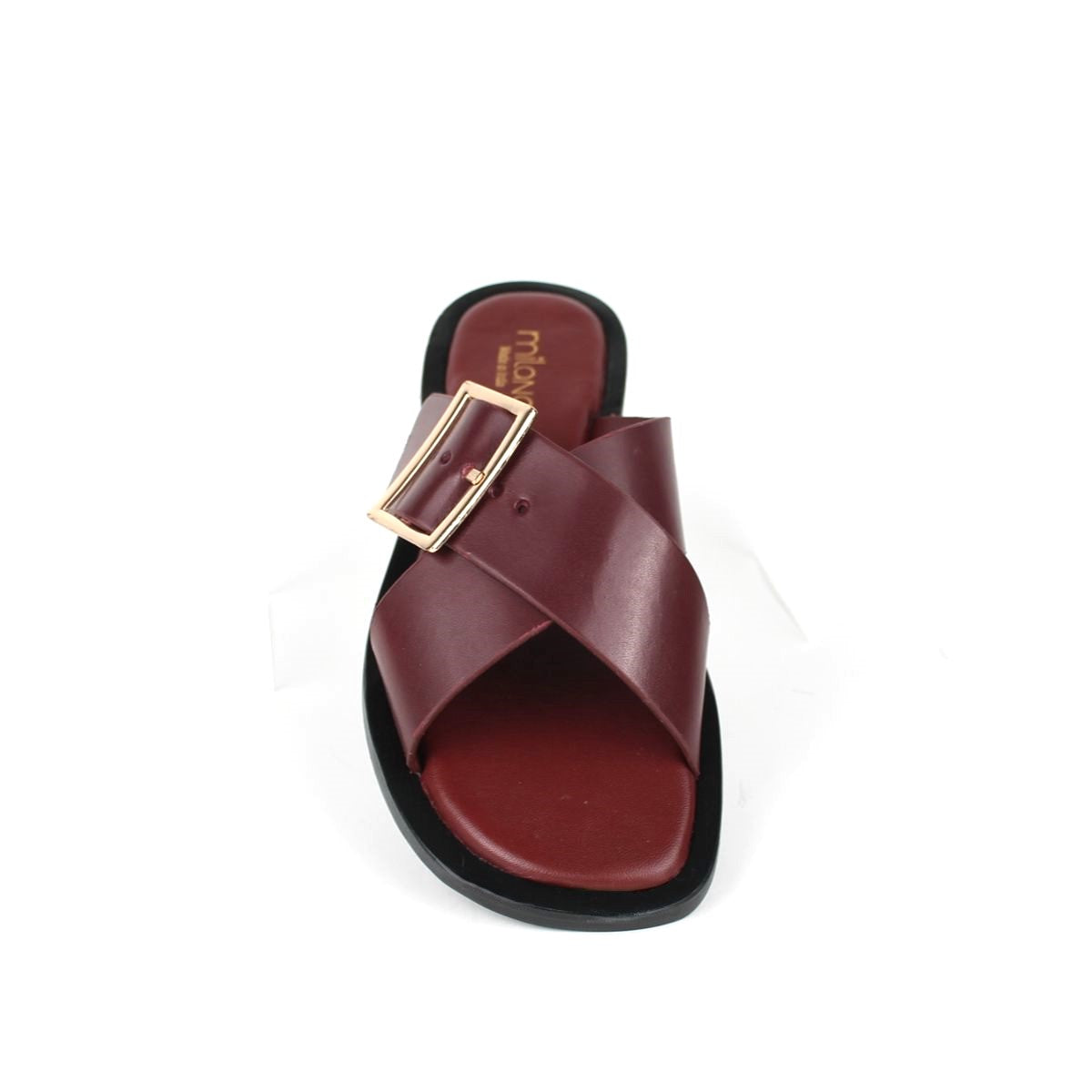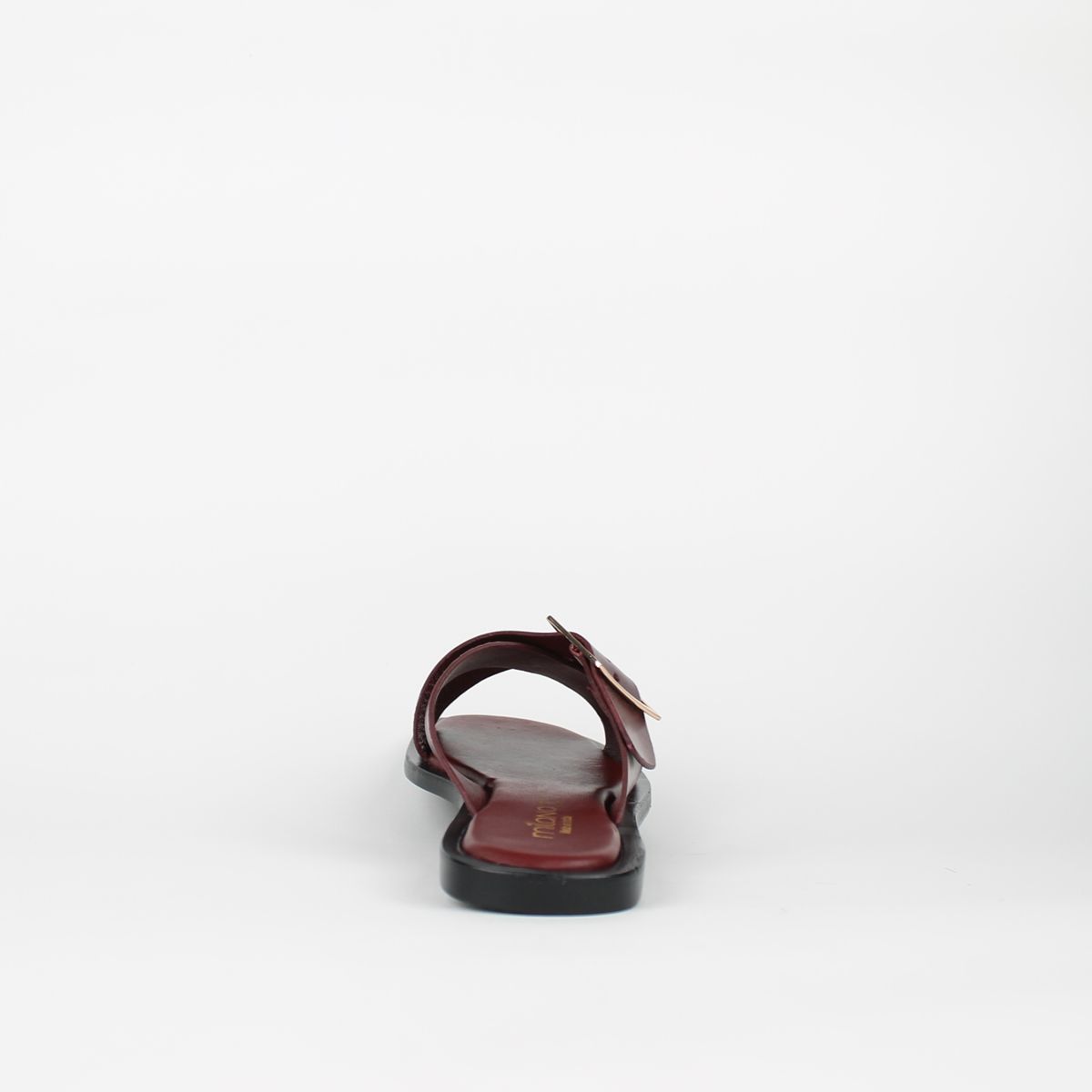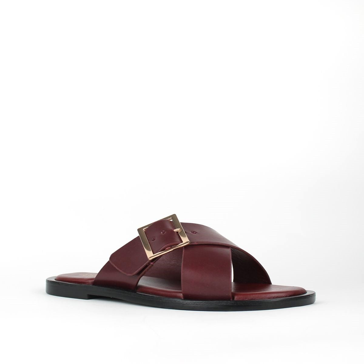 Featuring a rich oxblood red leather and a chunky gold buckle, these slip-on sandals are a stylish and comfortable choice for warm weather. The wide, crisscross straps provide a secure fit, while the padded insole and durable black sole ensure all-day comfort.