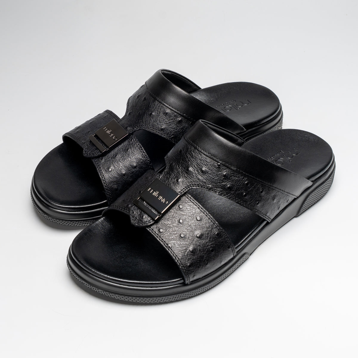 This high cushioned traditional slip on sandal is one of our newest take on some of our winning styles. The leather has been artistinally curated into our newest ostrich print collection which offers a distinctive yet refined look to our tradtional sandal's collection and combines the durability and smooth feel of the material.