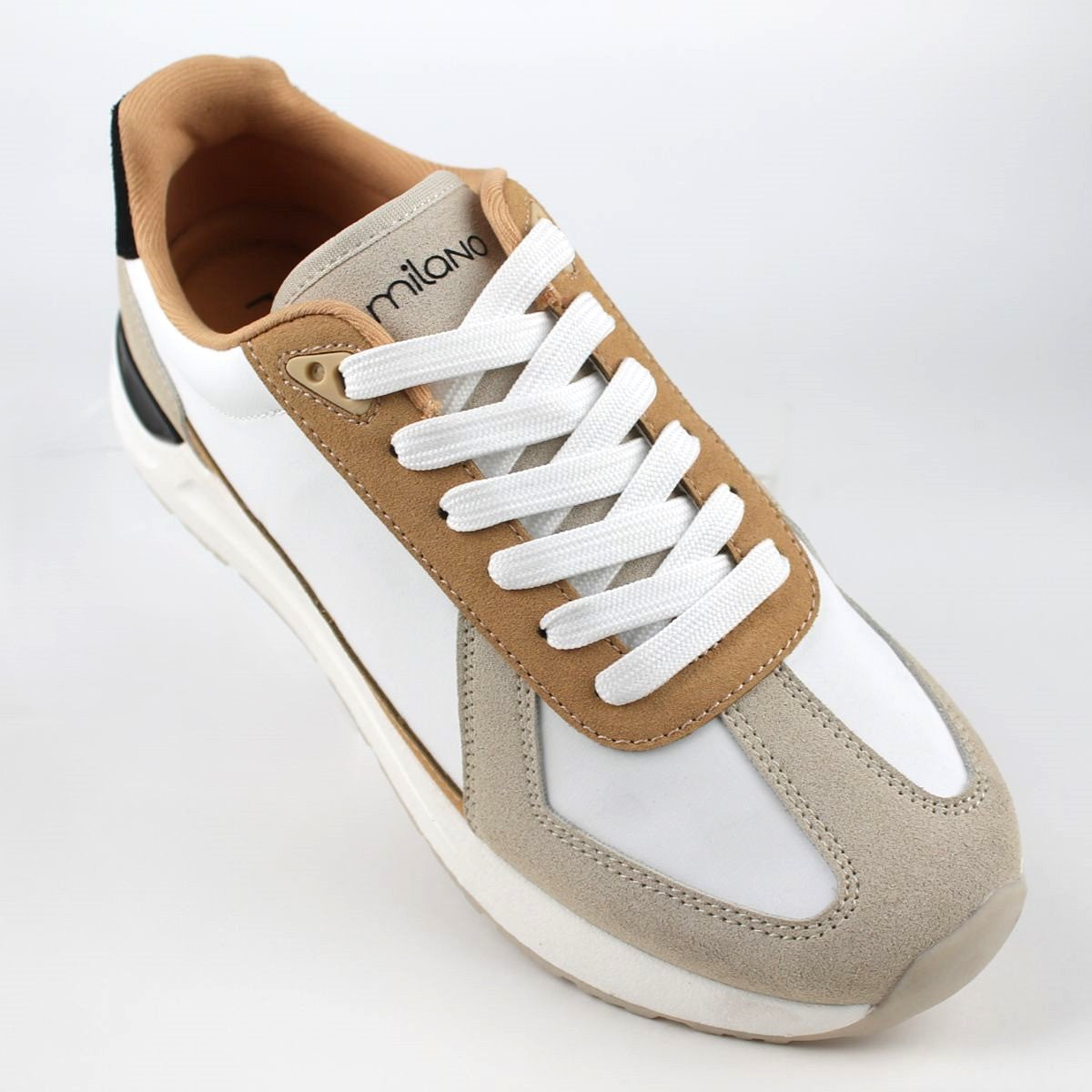 Stylish and versatile, these trainers feature a contemporary multi-tone design. The upper combines smooth white panels with tan and beige suede-like materials for a dynamic look. These shoes are perfect for a casual, yet refined, everyday style.