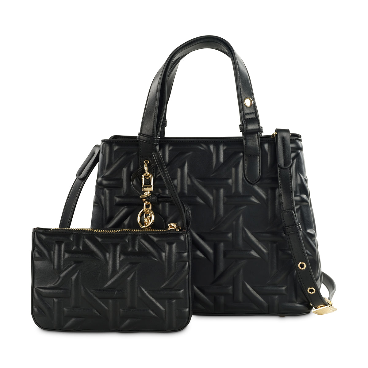 Elevate your everyday with our sophisticated black tote and matching pouch set. Both pieces feature a unique debossed pattern that adds subtle texture and modern style. The spacious tote comes with elegant top handles and a charming gold-tone key detail, while the coordinating zipped pouch offers versatile organization, perfect for keeping essentials close at hand.