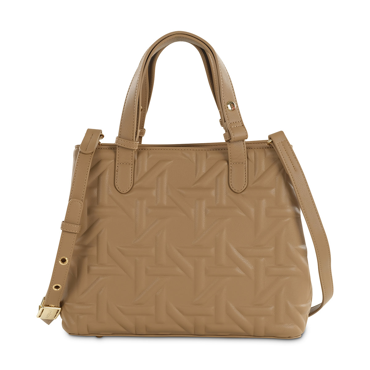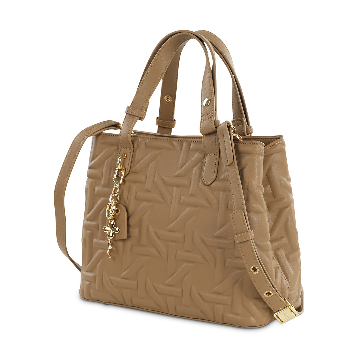 Elevate your everyday with our sophisticated taupe tote and matching pouch set. Both pieces feature a unique debossed pattern that adds subtle texture and modern style. The spacious tote comes with elegant top handles and a charming gold-tone key detail, while the coordinating zipped pouch offers versatile organization, perfect for keeping essentials close at hand.