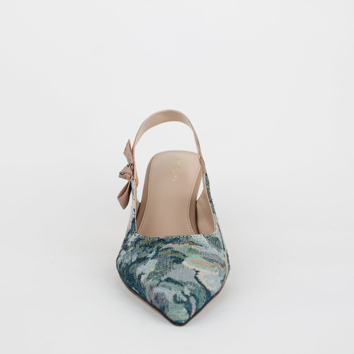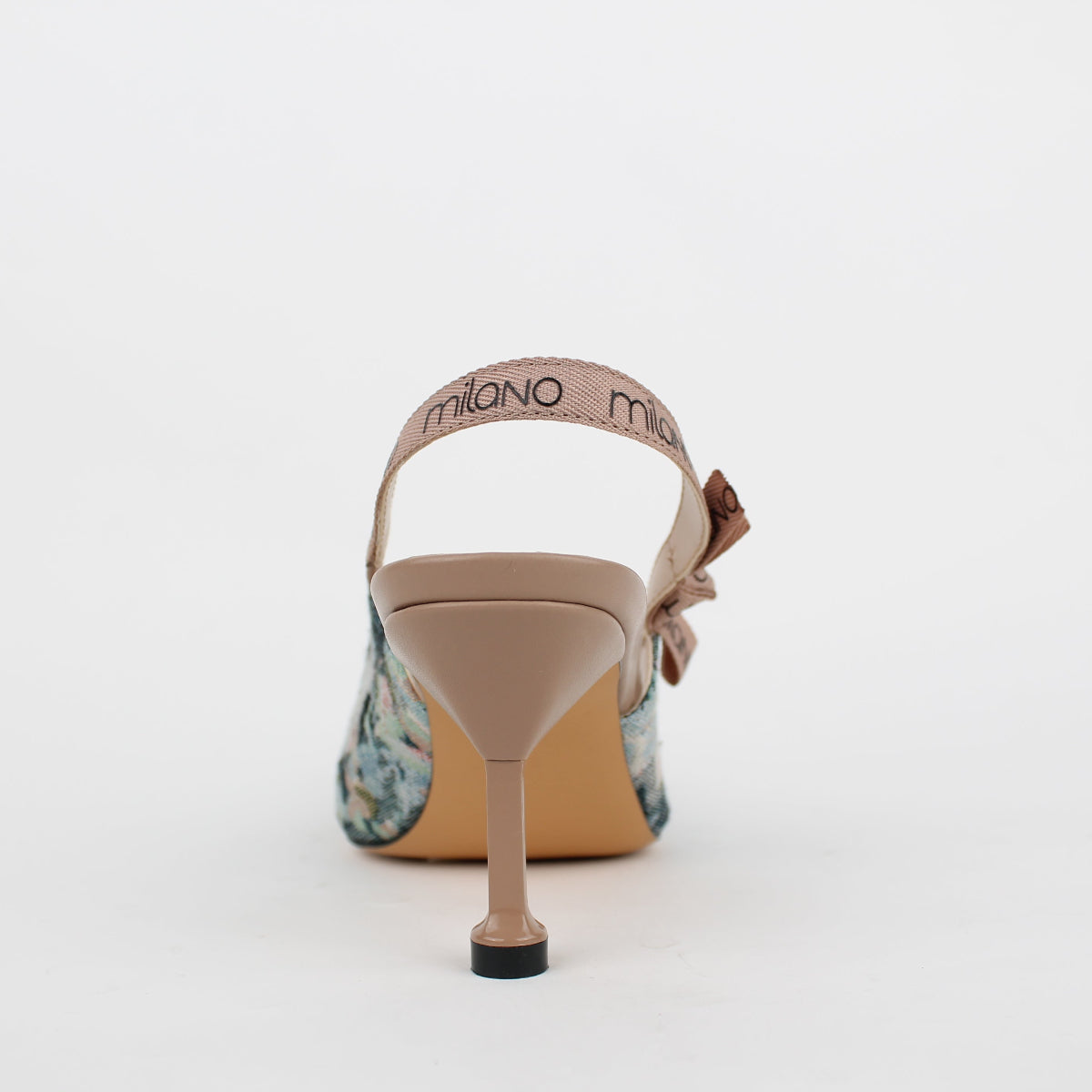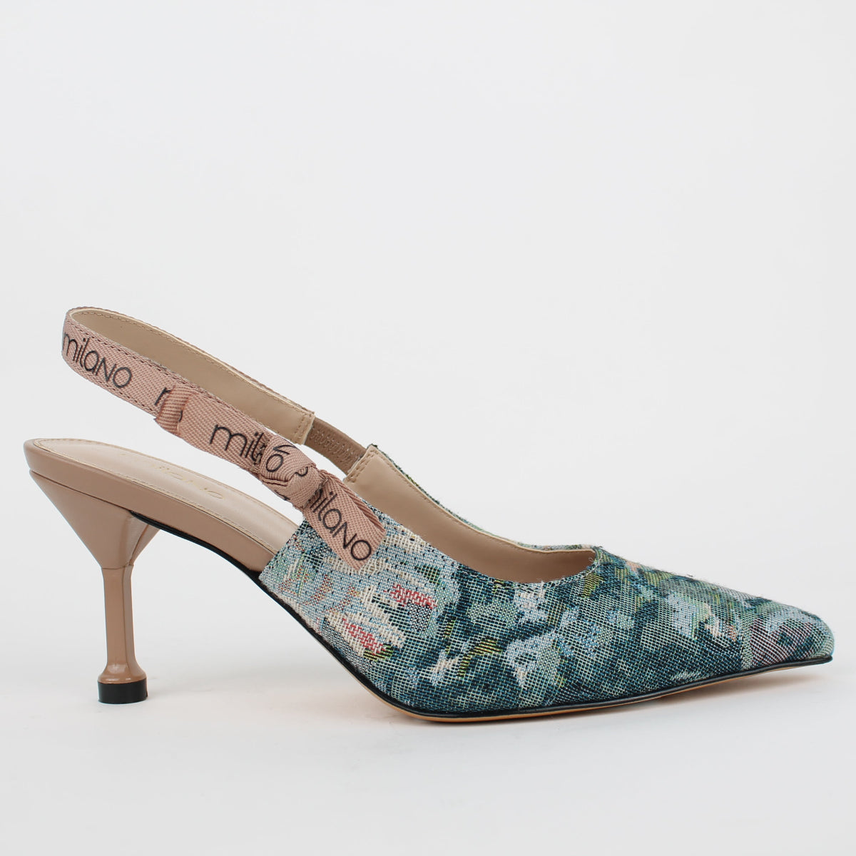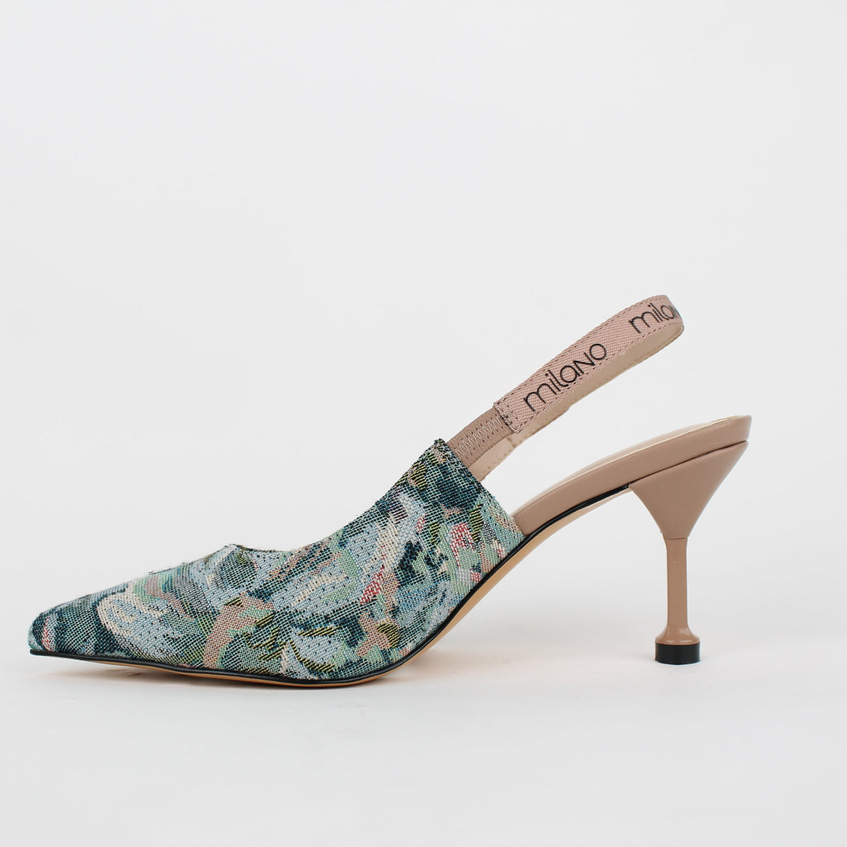 Make a statement in these stylish slingback pumps featuring a unique multi-color floral or tapestry-style print. The standout feature is the elastic slingback strap, which is printed with a Milano branded logo for a contemporary look. Perfect for adding a pop of personality to any outfit.