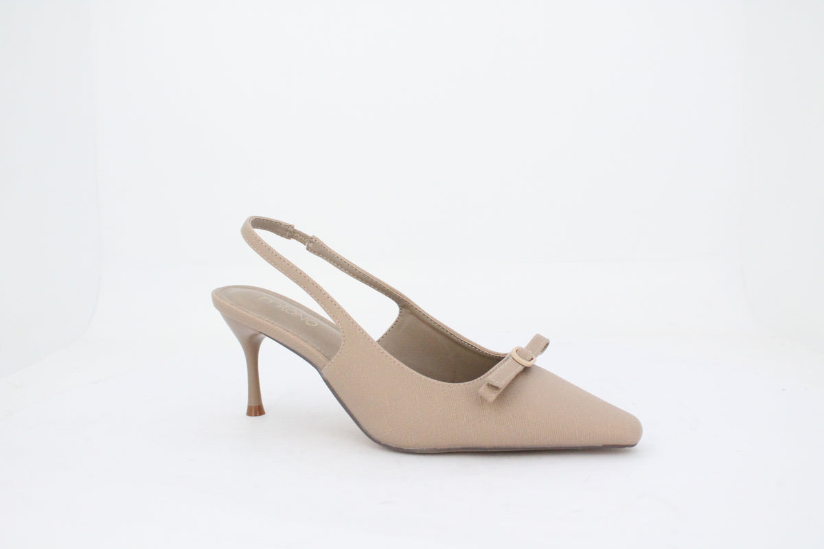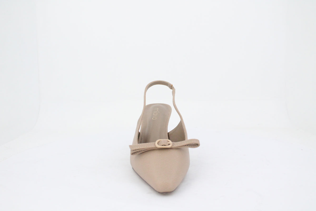 Elevate your ensemble with the sophisticated Frayda Stiletto slingbacks. Crafted in a chic saffiano material. These slingbacks feature a classic sligtly chiseled toe and a delicate bow accent for a touch of feminine grace. The elegant stiletto heel offers a refined lift, perfect for any occasion. It comes with a matching bag for a coordinated look.