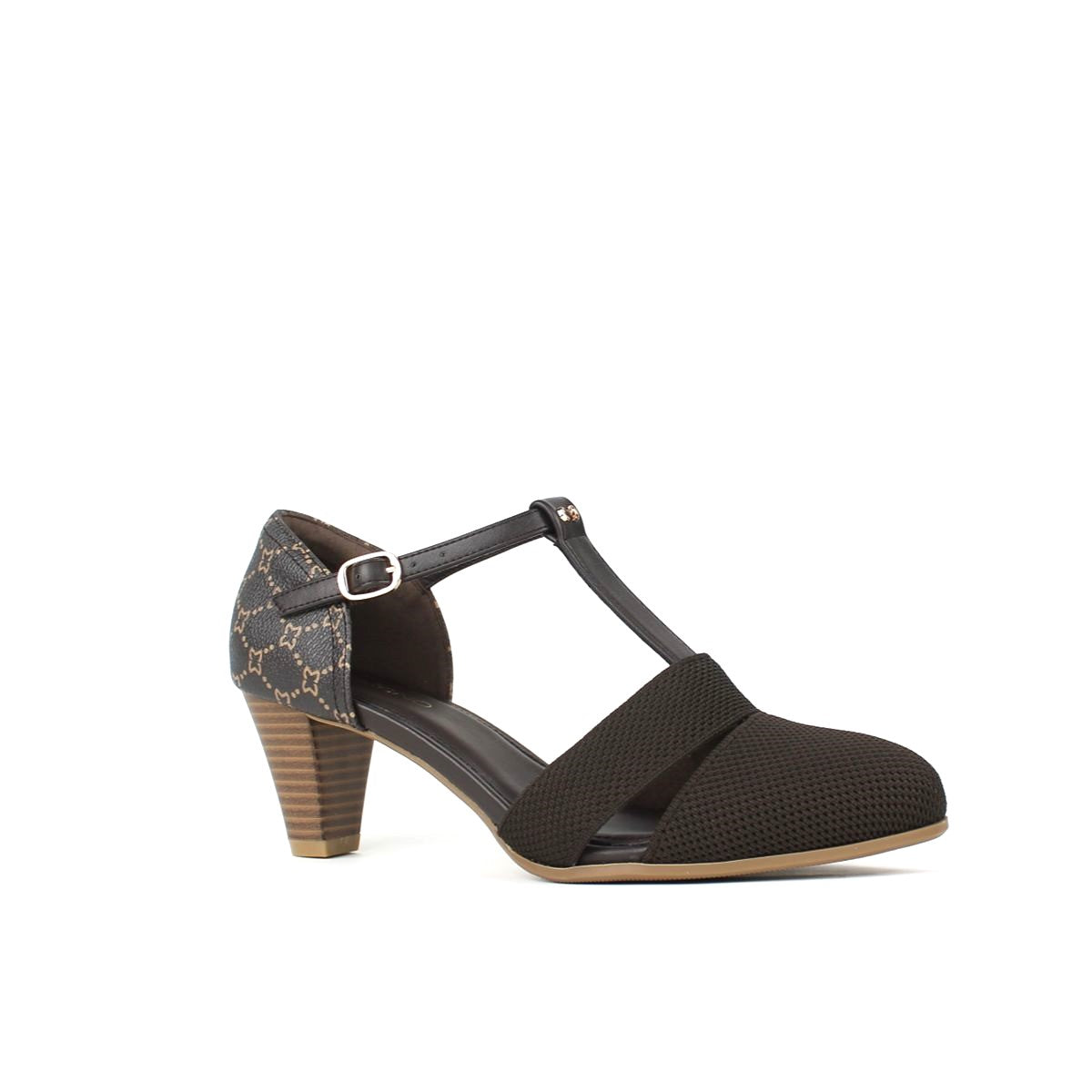 Refined and stylish, these women's T-strap pumps feature a unique two-tone design, with a classic mesh texture on the vamp and an elegant monogram pattern on the back. The comfortable mid-height cone heel with a wood-grain finish provides a stable lift, while the round toe offers a more comfortable fit than traditional styles. Secured with a T-strap and an adjustable buckle to ensure a personalized and secure fit, making them a perfect blend of elegance and functionality.