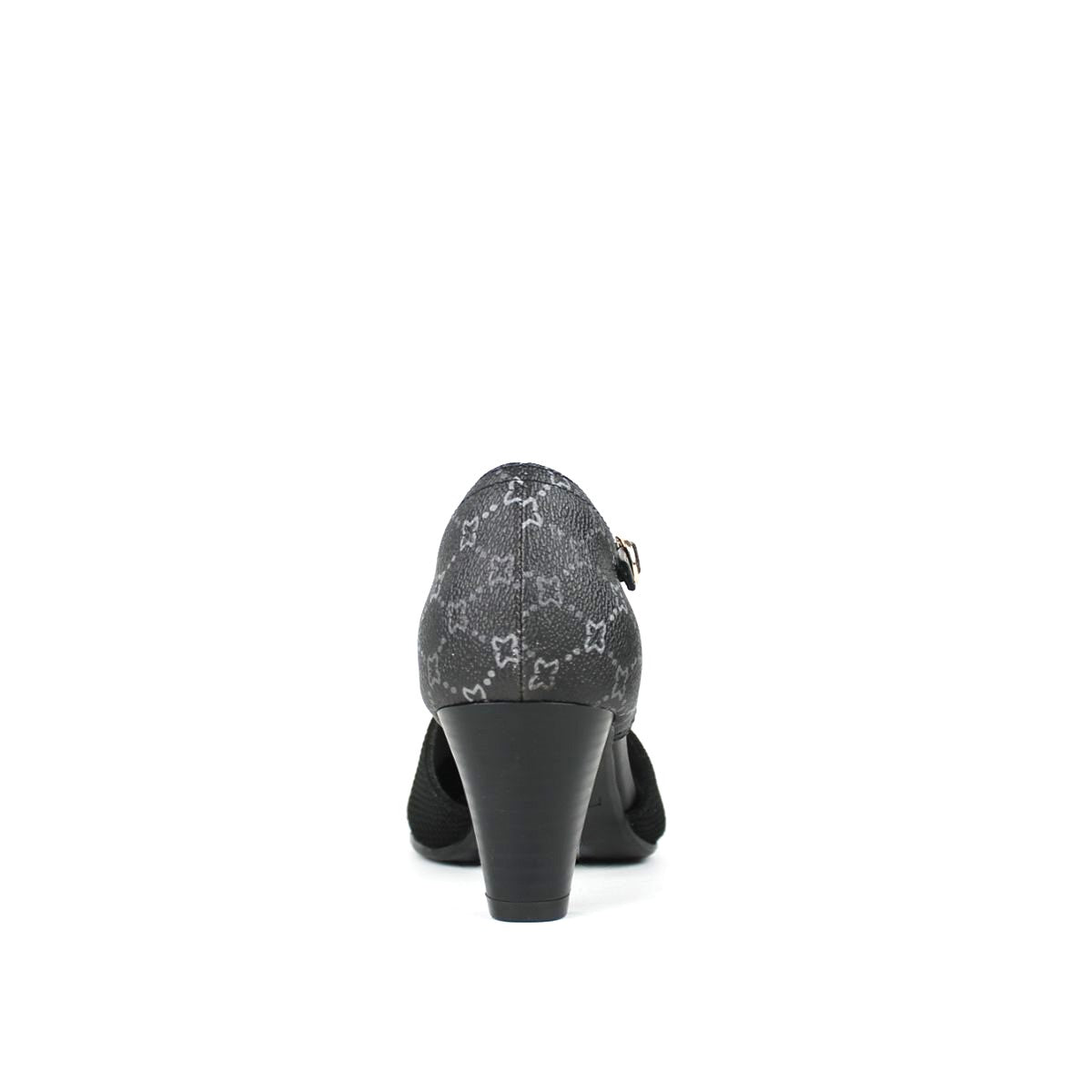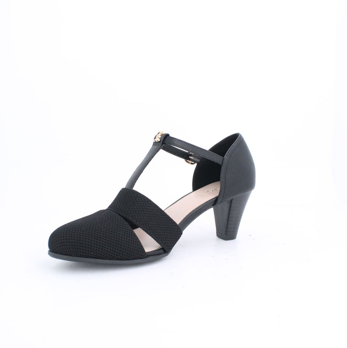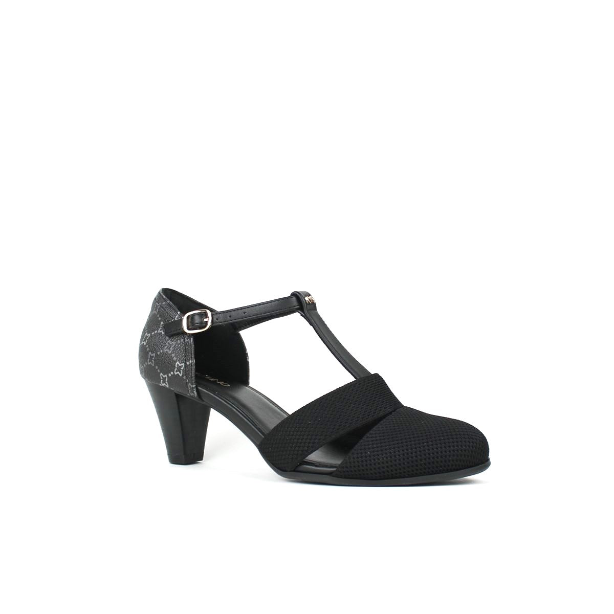 Refined and stylish, these women's T-strap pumps feature a unique two-tone design, with a classic mesh texture on the vamp and an elegant monogram pattern on the back. The comfortable mid-height cone heel with a wood-grain finish provides a stable lift, while the round toe offers a more comfortable fit than traditional styles. Secured with a T-strap and an adjustable buckle to ensure a personalized and secure fit, making them a perfect blend of elegance and functionality.