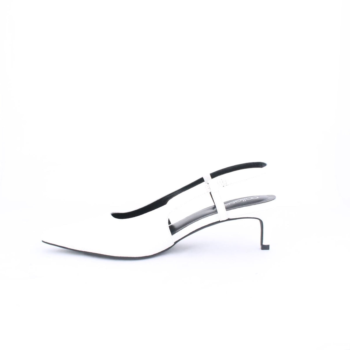 Elegant white slingback kitten heels with a closed pointed toe, cut-out pattern design, golden sole, and a comfort footbed. It comes with a matching bag for a coordinated look. Perfect for adding a touch of sophisticated style to any occasion.