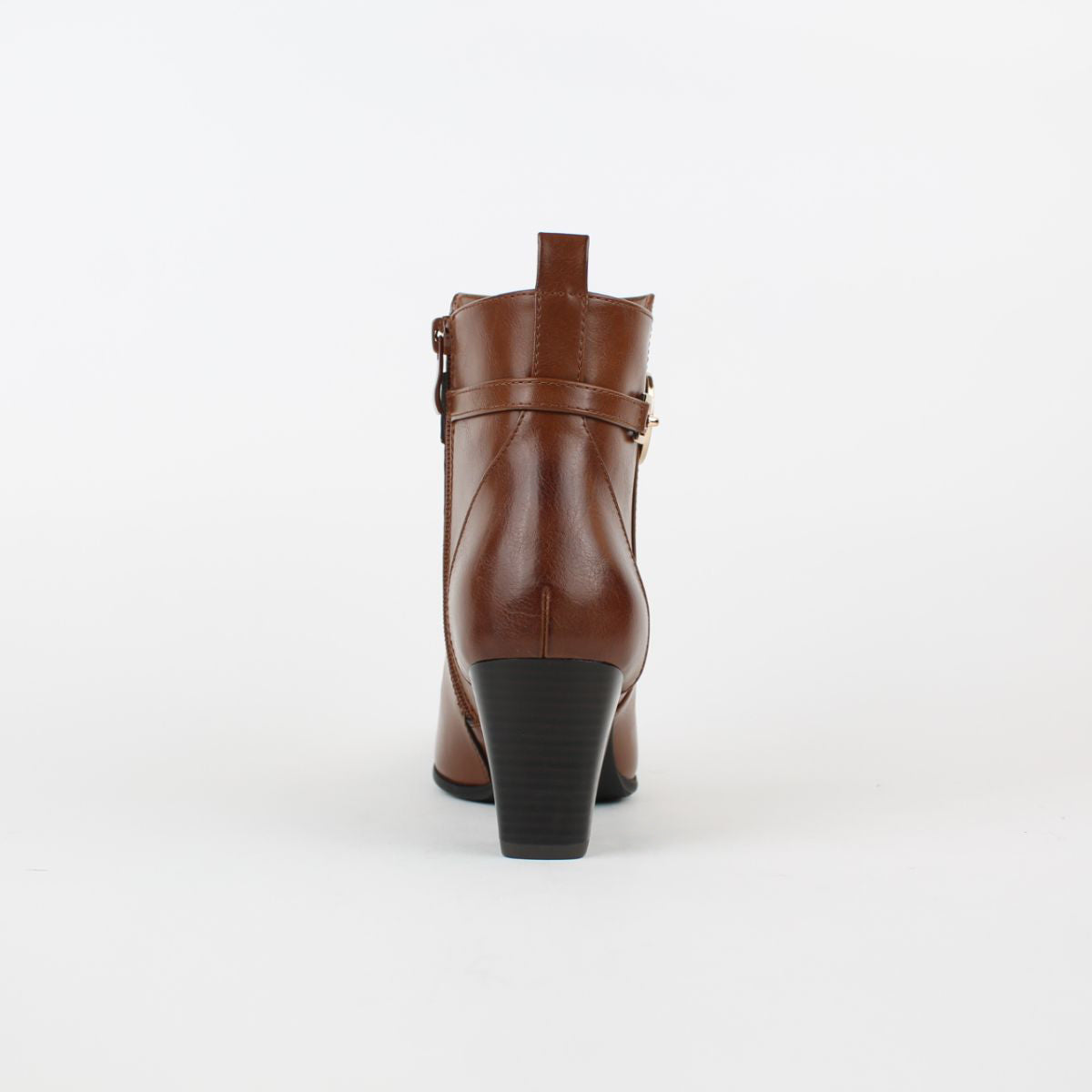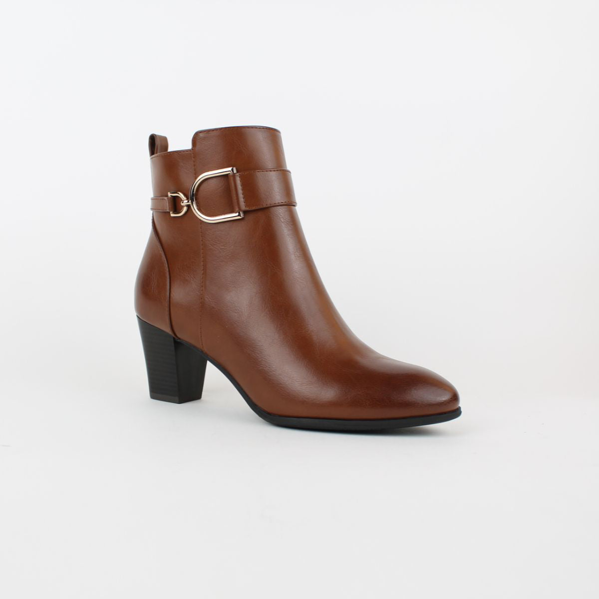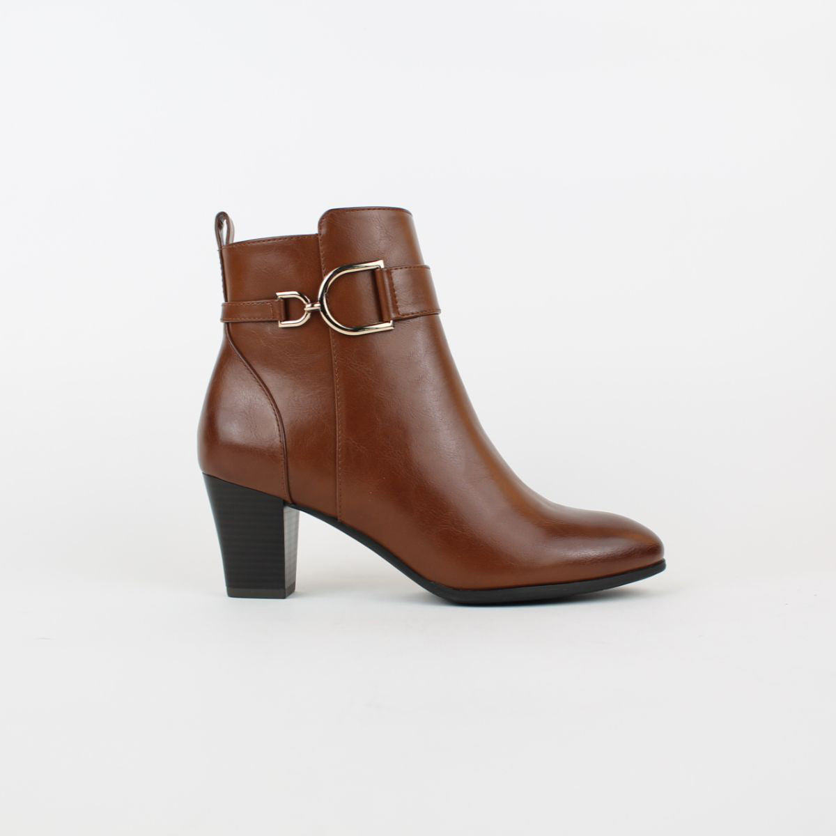 A sleek black ankle boot with a mid-heighted block heel and a striking gold buckle accent on the side, perfect for adding an edgy touch to any outfit.
