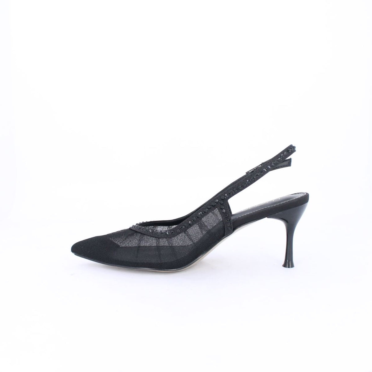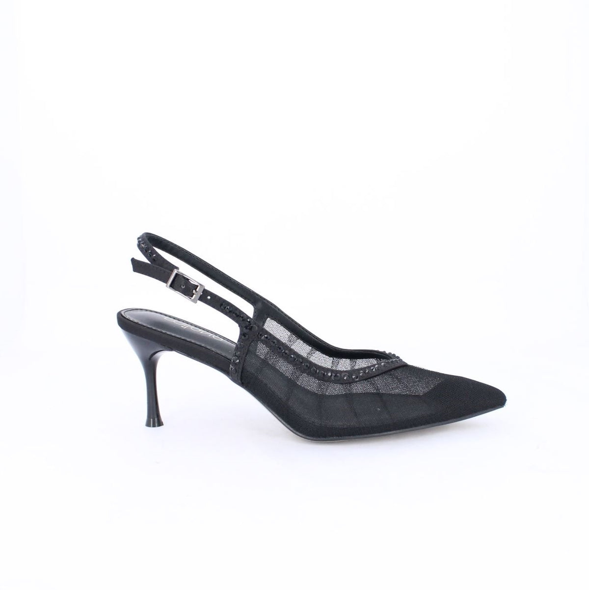 Elevate your evening style with these Pamella Slingback Heels. Crafted with a sophisticated pointed toe and a sleek stiletto heel, these shoes exude elegance. The design features delicate mesh panels accented with subtle embellishments, adding a touch of allure. The adjustable slingback strap ensures a comfortable and secure fit, making them a perfect choice for special occasions and glamorous events.