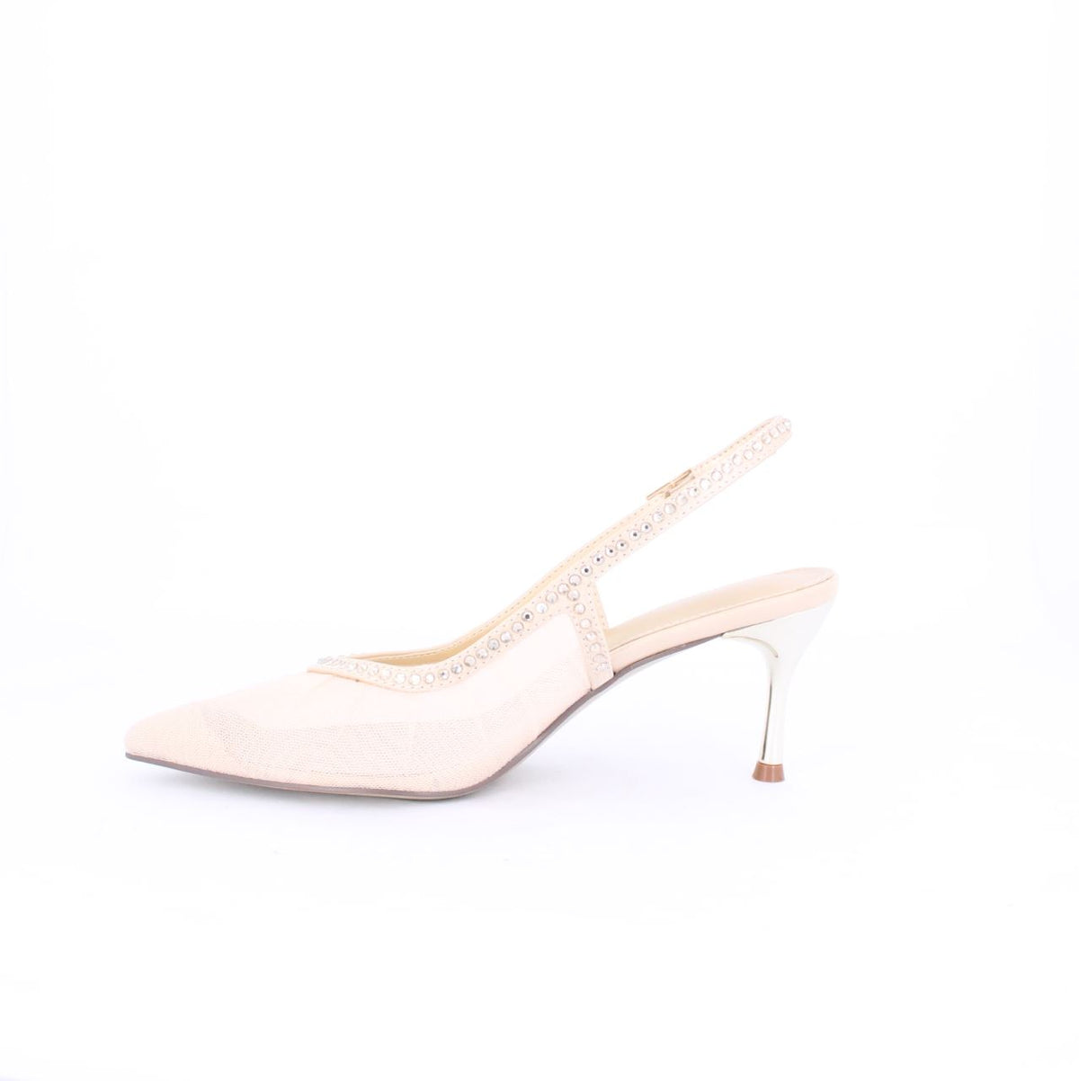 Elevate your evening style with these Pamella Slingback Heels. Crafted with a sophisticated pointed toe and a sleek stiletto heel, these shoes exude elegance. The design features delicate mesh panels accented with subtle embellishments, adding a touch of allure. The adjustable slingback strap ensures a comfortable and secure fit, making them a perfect choice for special occasions and glamorous events.