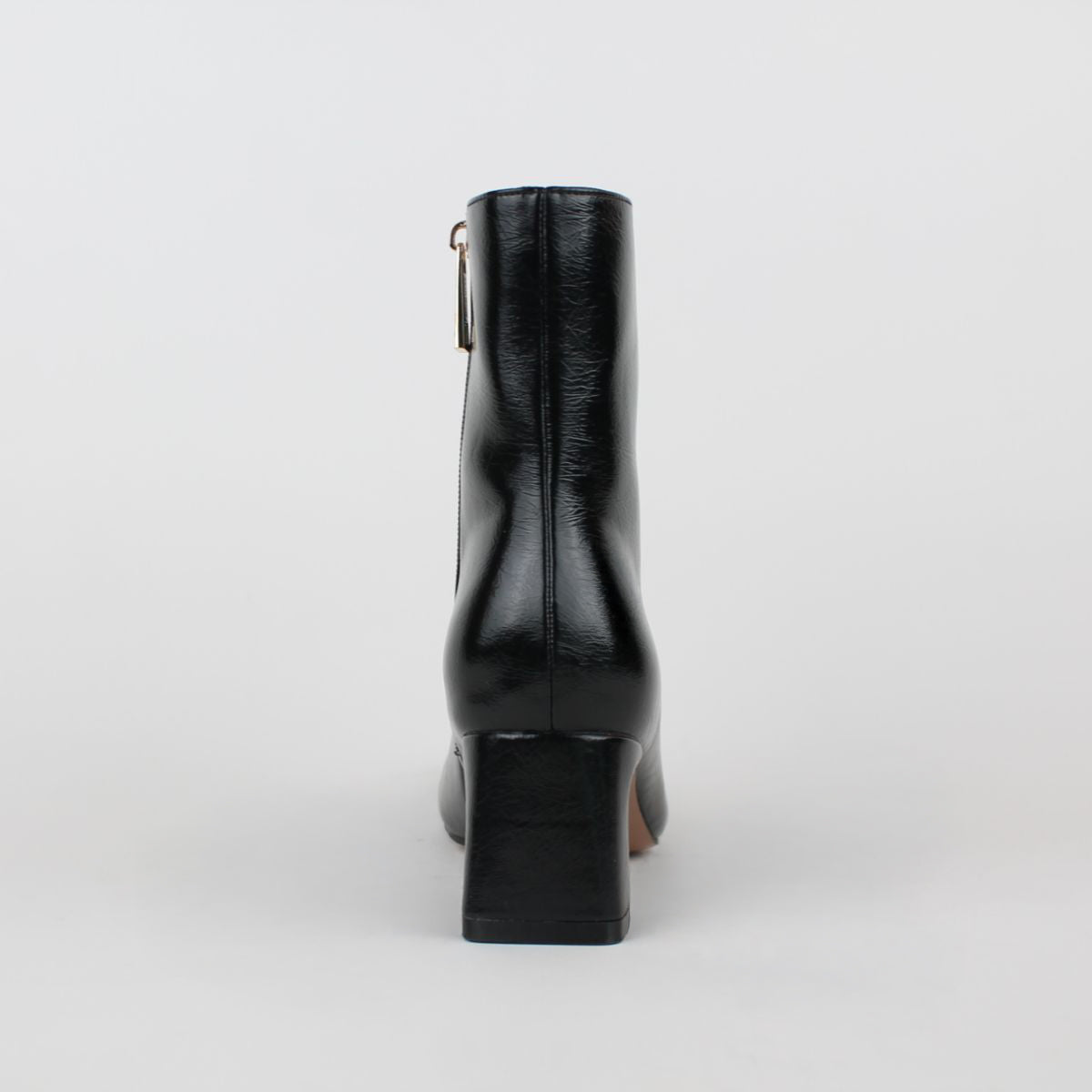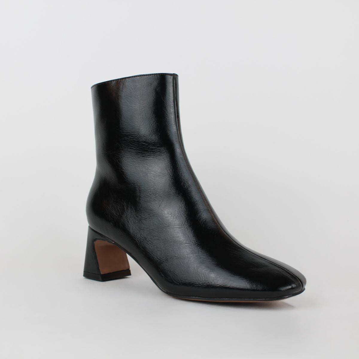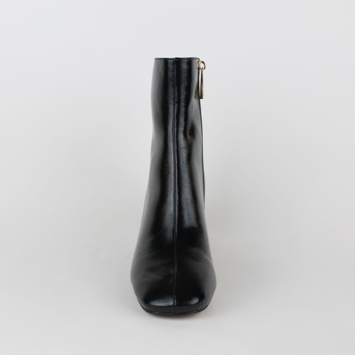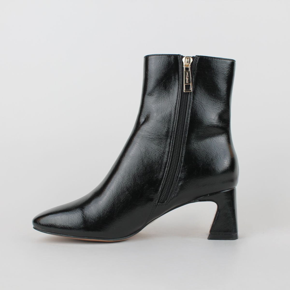A sleek, modern ankle boot with a patent-leather look, featuring a unique sculptural heel and a discreet inside zipper for easy on and off.