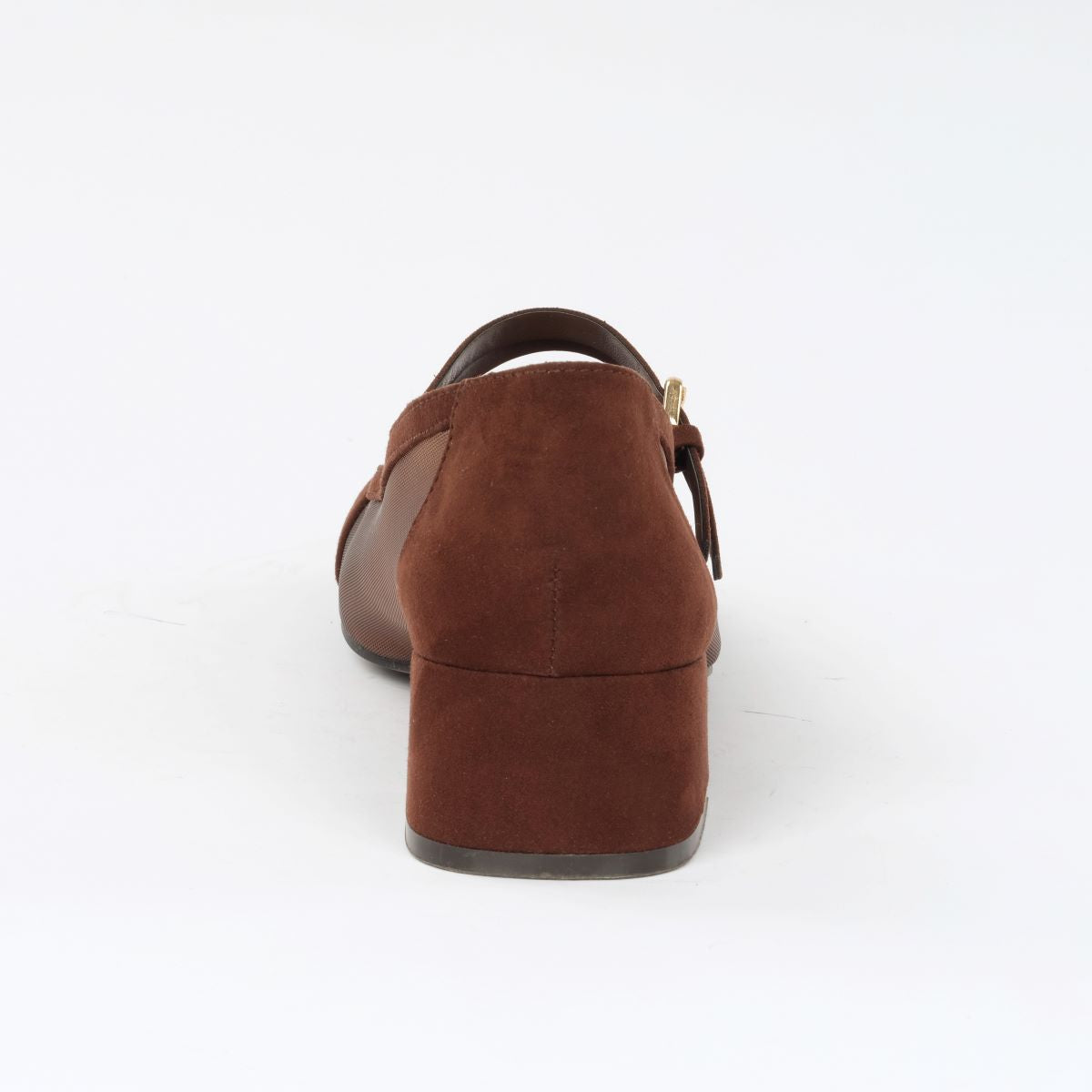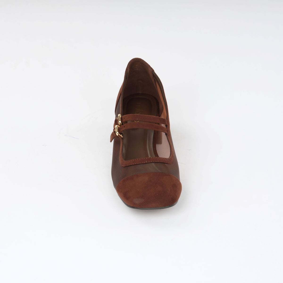 A unique Mary Jane pump, featuring a mesh upper, a comfortable block heel, and double buckle straps. It’s perfect for adding a touch of vintage elegance to any look.
