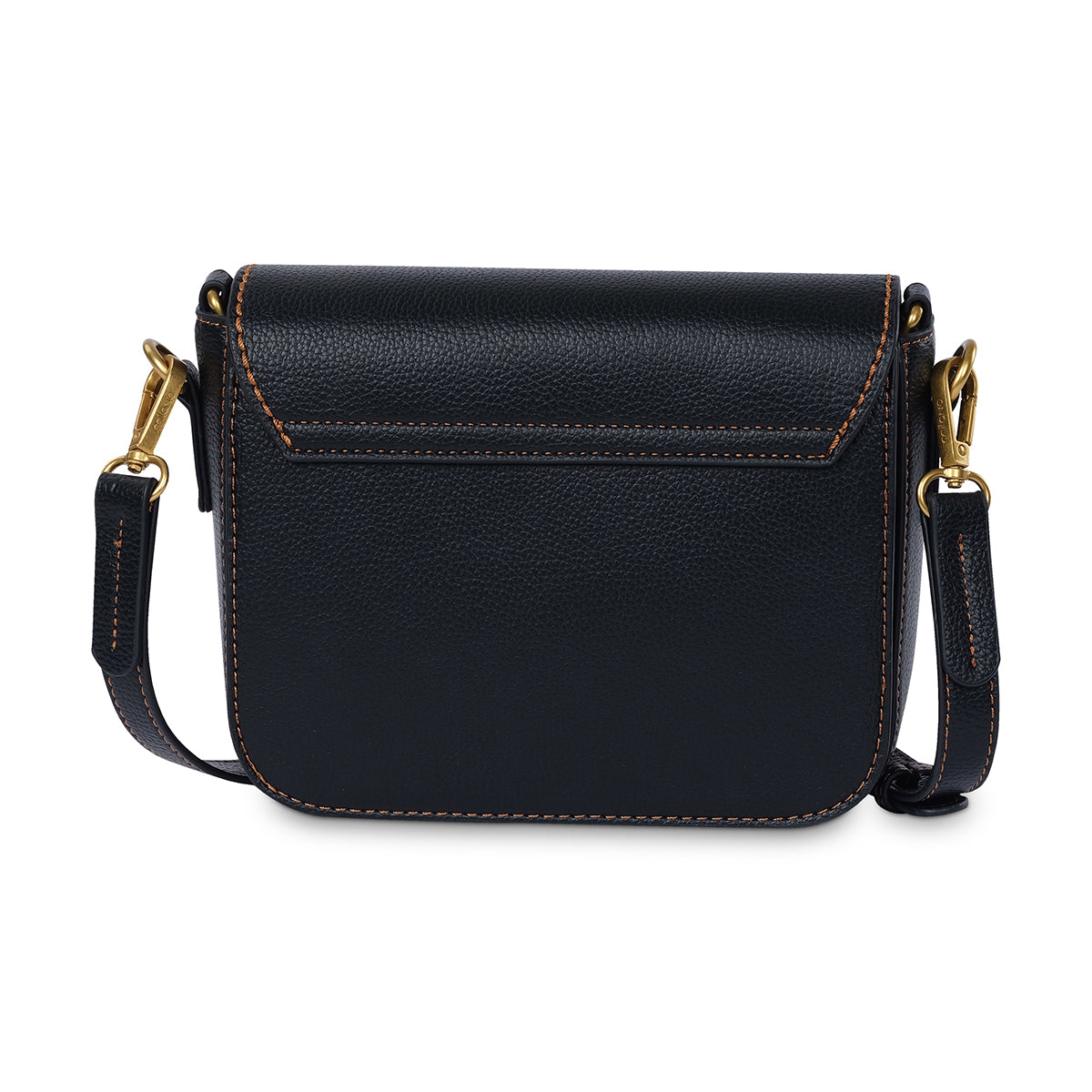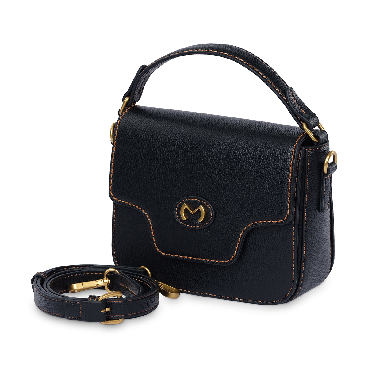 Black grainy faux leather crossbody with sophisticated contrast detail, branded with our signature M plate. Featuring a grab handle in additional detachable long strap