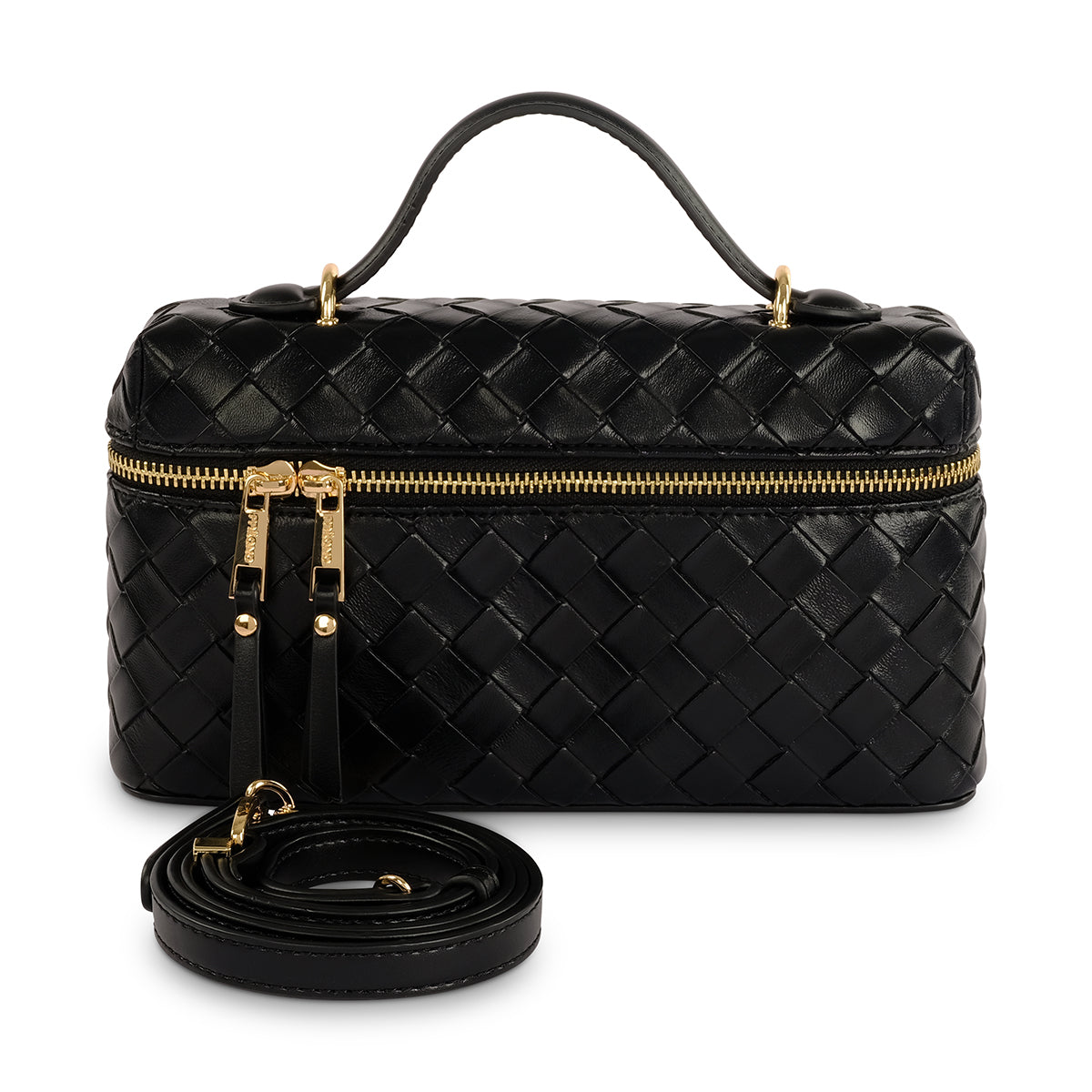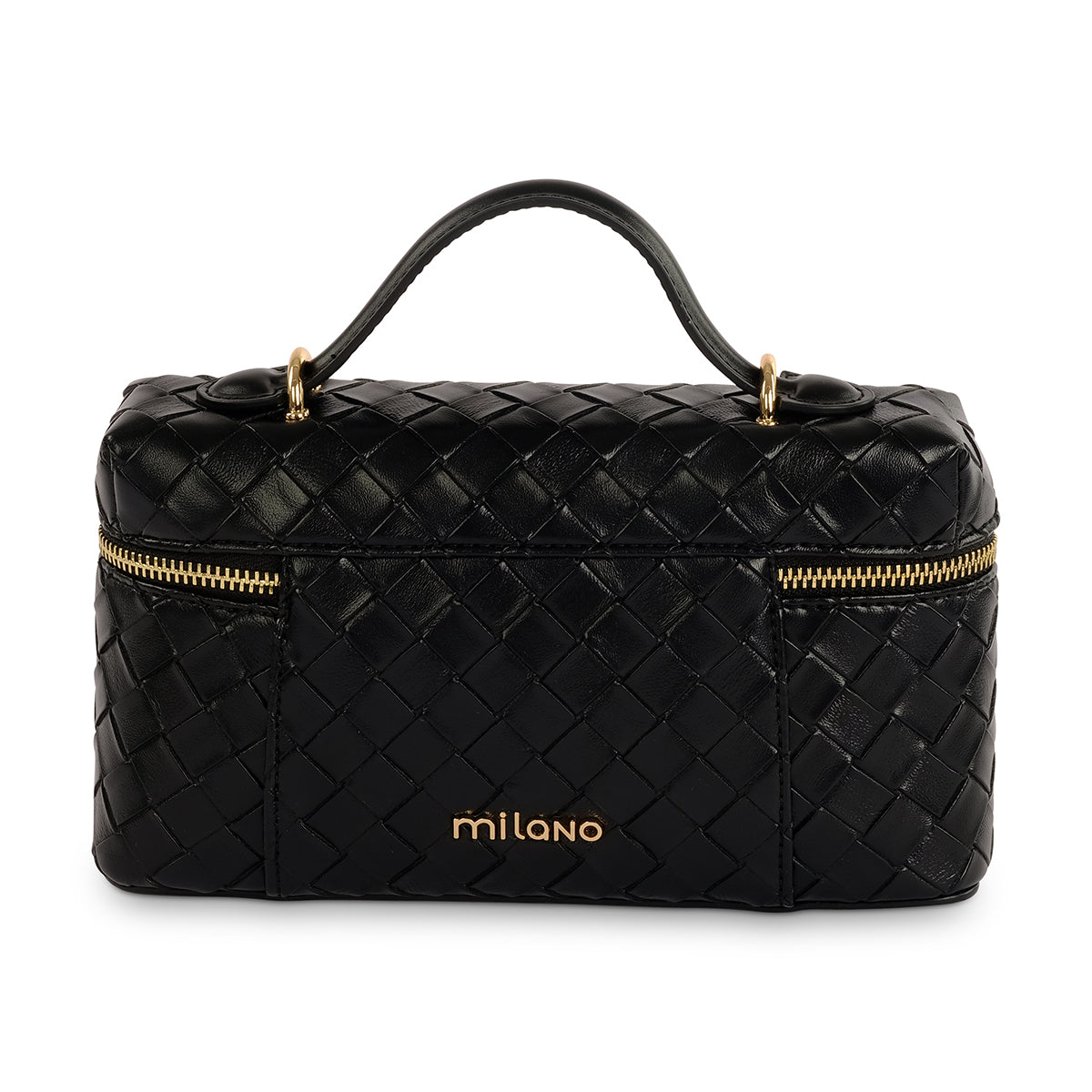 Black weave detail grab bag with Milano branded hardware. Featuring main zip closure and internal phone pockets for added security, as well as a detachable and adjustable long strap