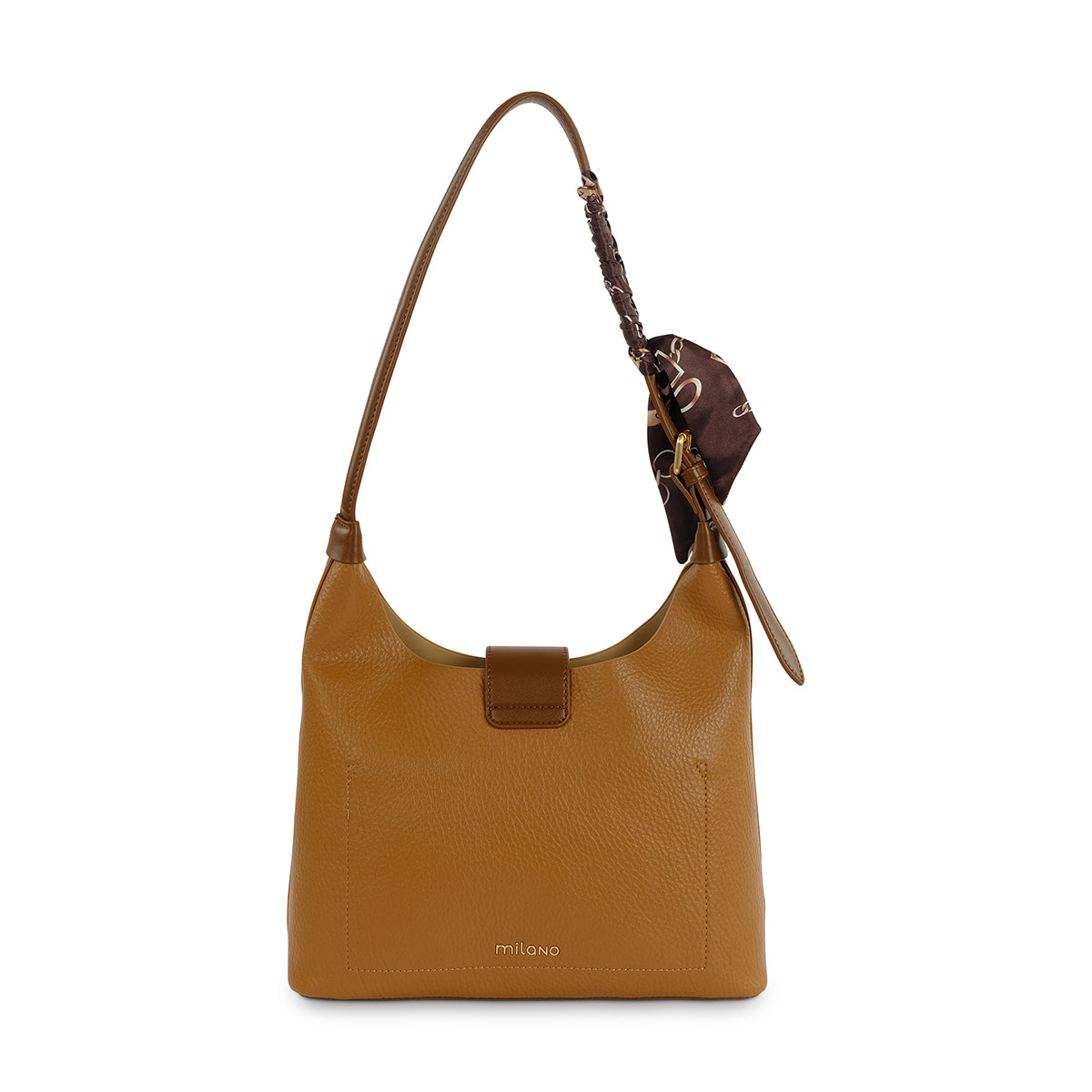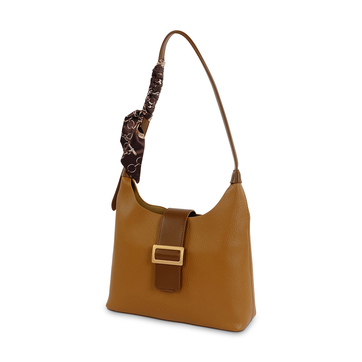 This bag is a versatile and chic hobo style with a sophisticated silhouette. Its relaxed yet structured form is complemented by a curved top handle and a comfortable, detachable shoulder strap. The bag's tan body is beautifully contrasted by a brown strap, making it a stylish and easy accessory for daily use.