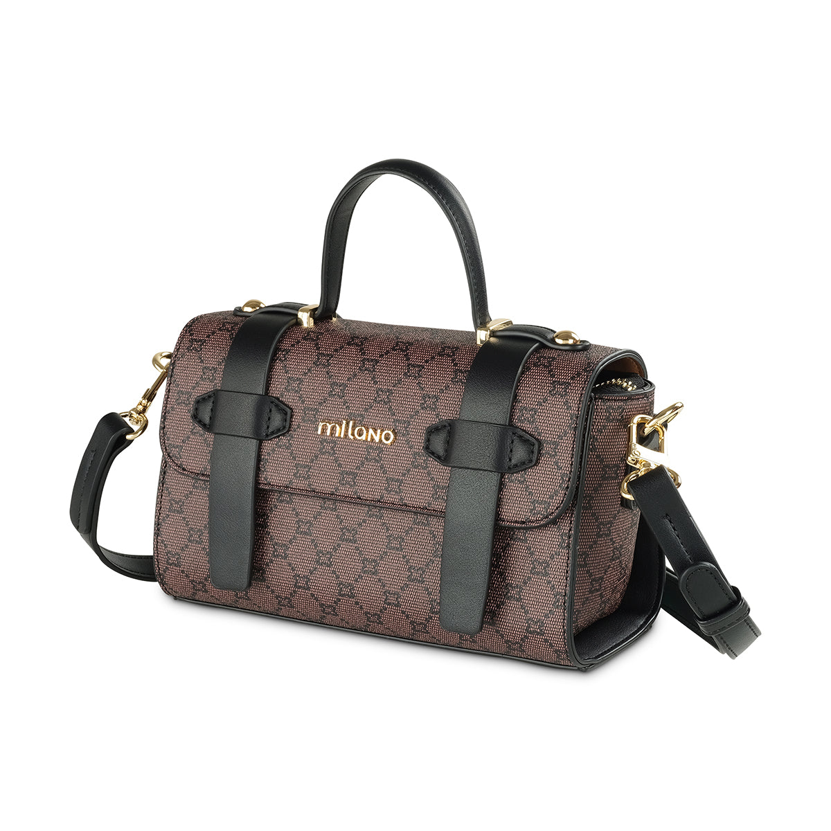 Make a bold statement with our structured flap bag, featuring a rich brown monogram print beautifully contrasted by sleek black accents on the flap, handle, and decorative straps. Adorned with polished gold-tone buckles and a signature "Milano" logo, this versatile bag offers sophisticated style for any occasion.