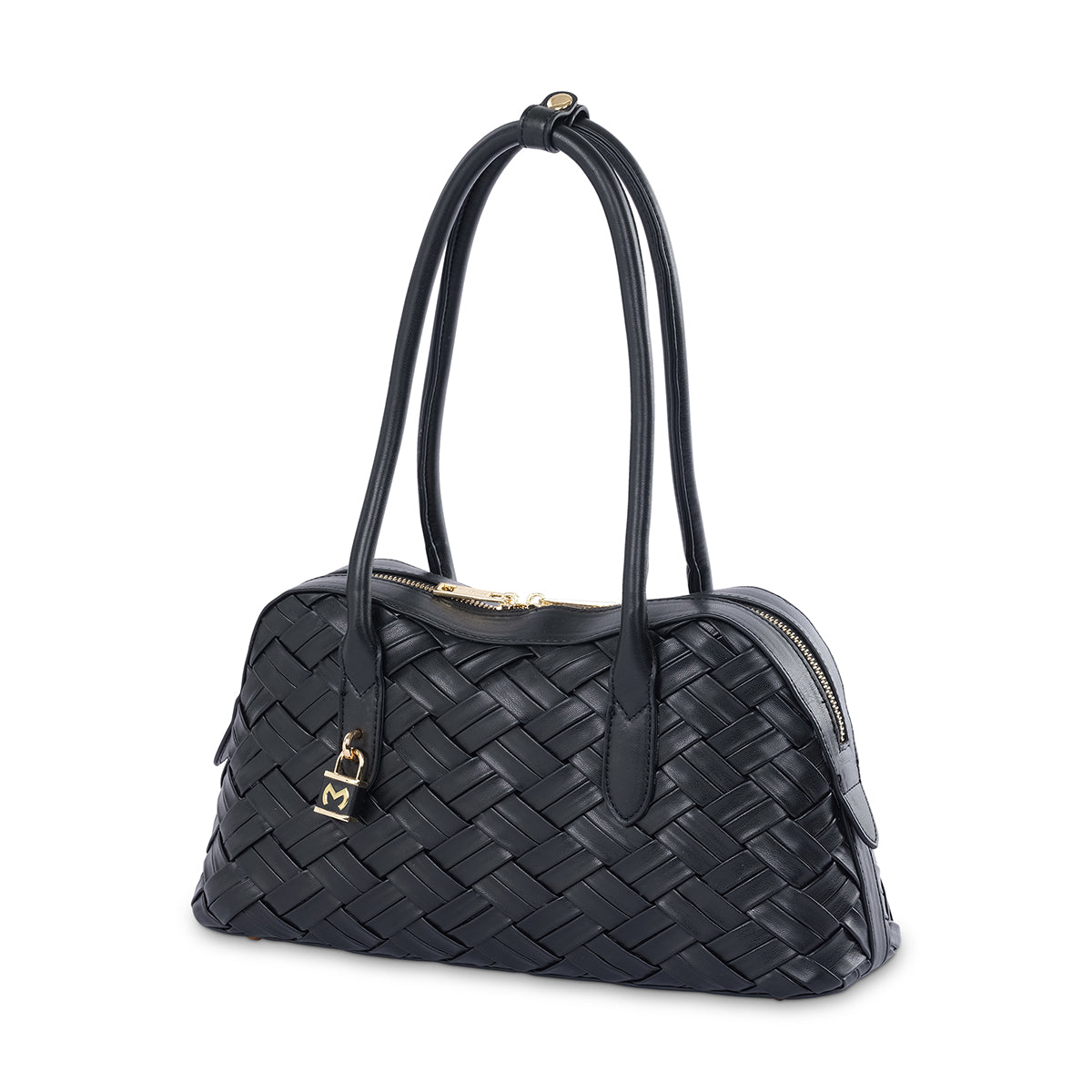 Meet the 'Milano' woven satchel, a sophisticated accessory that combines classic design with modern allure. Crafted in a rich black hue, the bag features a structured body with a detailed woven texture and polished top handles. The secure lock detail and elegant silhouette make it a perfect statement piece for any occasion.