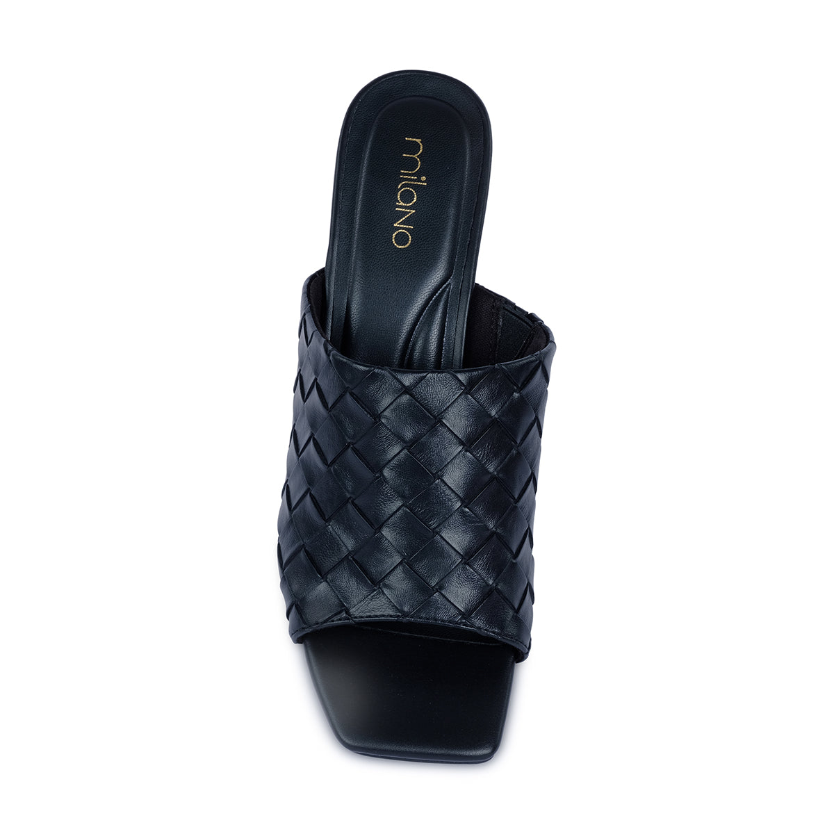Sleek black woven sandal with open toe and bold block heel. Features an intricate basket-weave texture for a modern, luxe finish.