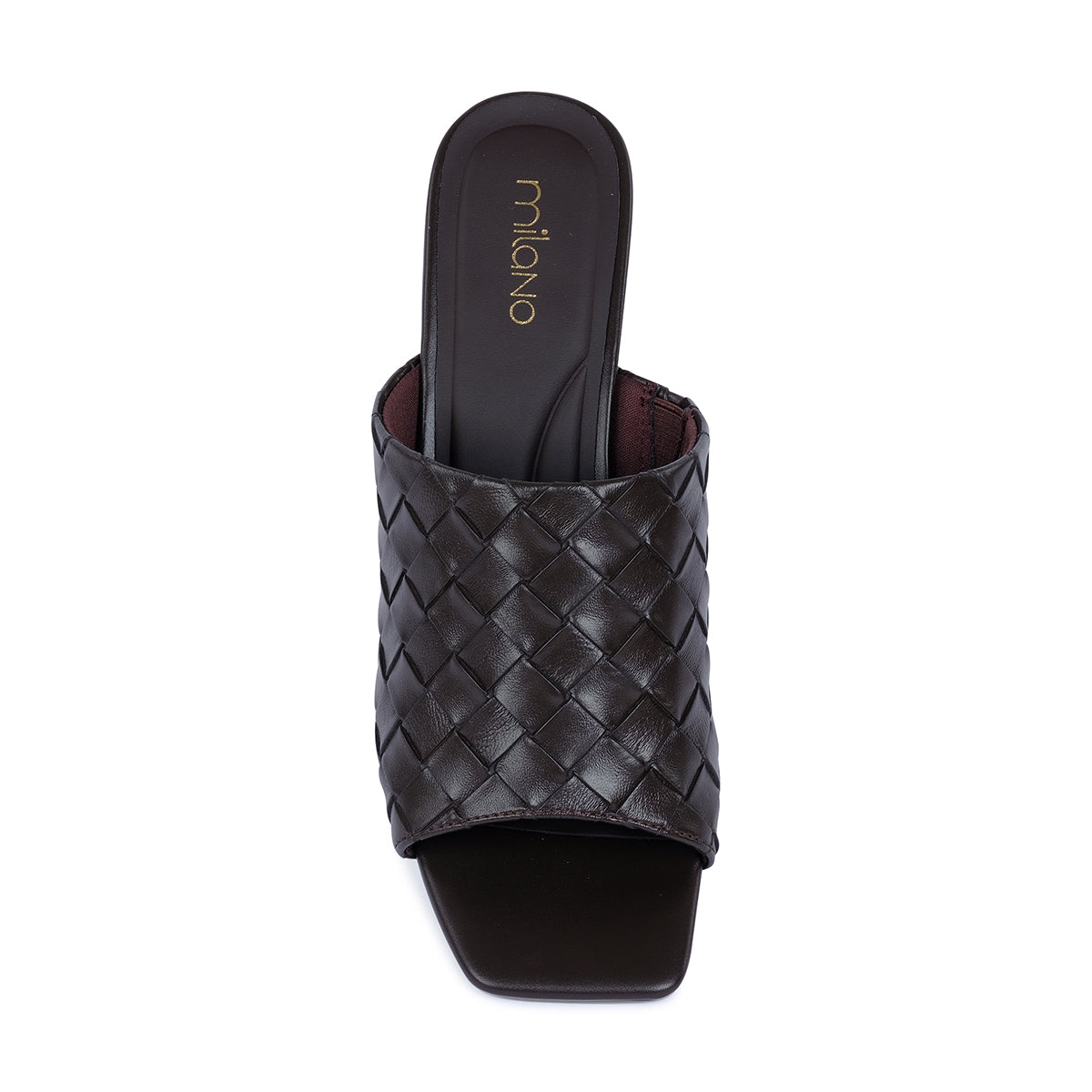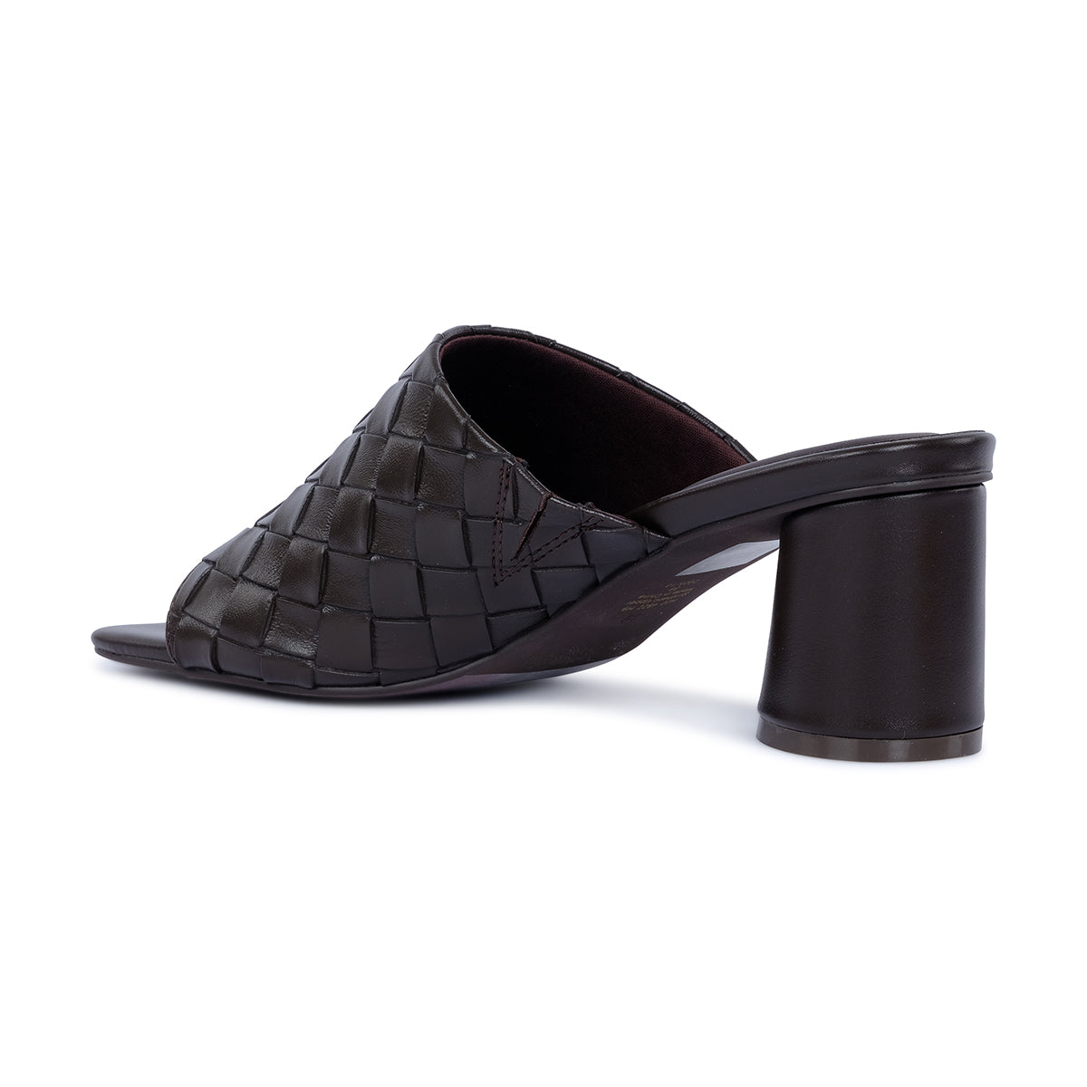 Sleek dark brown woven sandal with open toe and bold block heel. Features an intricate basket-weave texture for a modern, luxe finish.