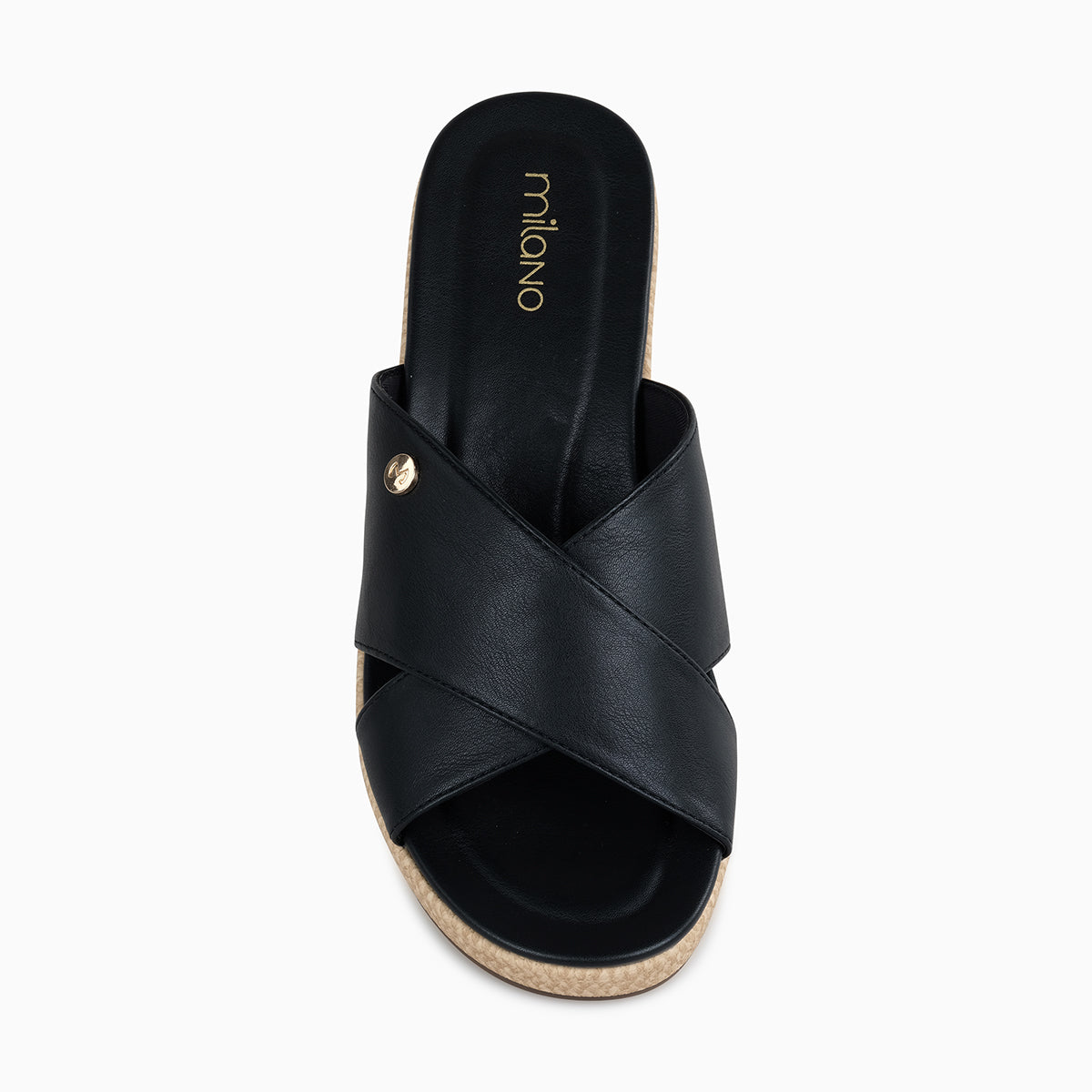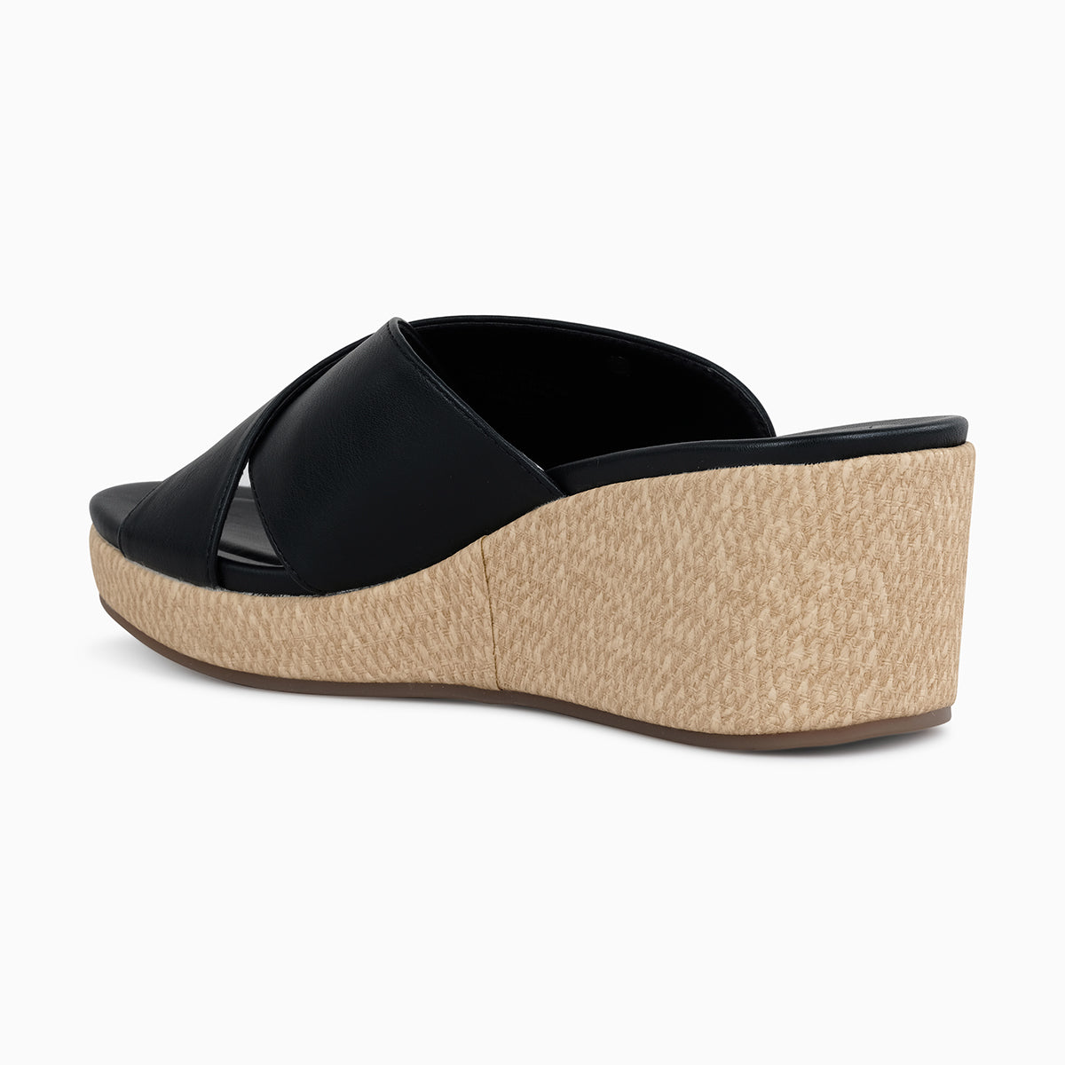 Classic black wedge sandal featuring wide crisscross straps with a subtle metallic logo accent. Designed with a cushioned footbed and a textured raffia-style wedge heel for comfort and a chic summer look—perfect for casual outings or vacation wear