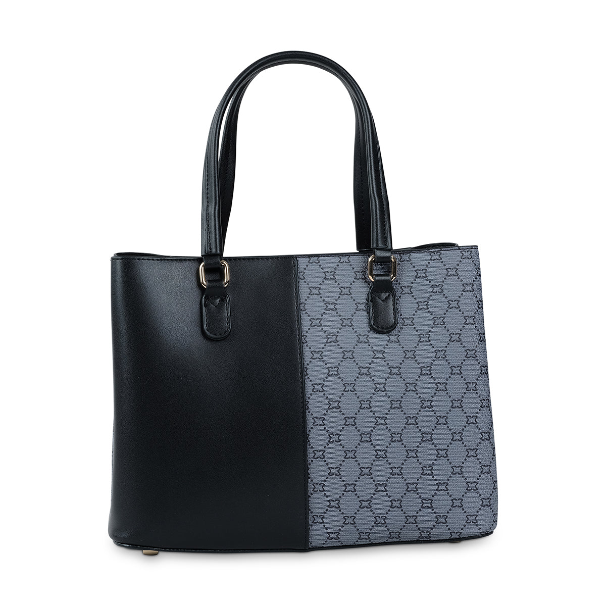 A stylish two- toned monogram bag, featuring a gold belted lock and contrasting dual texture design. Complete with sturdy grab handles and an adjustable strap for versatility. With multiple inner pockets and card slots, this bag is the perfect companion for your day out