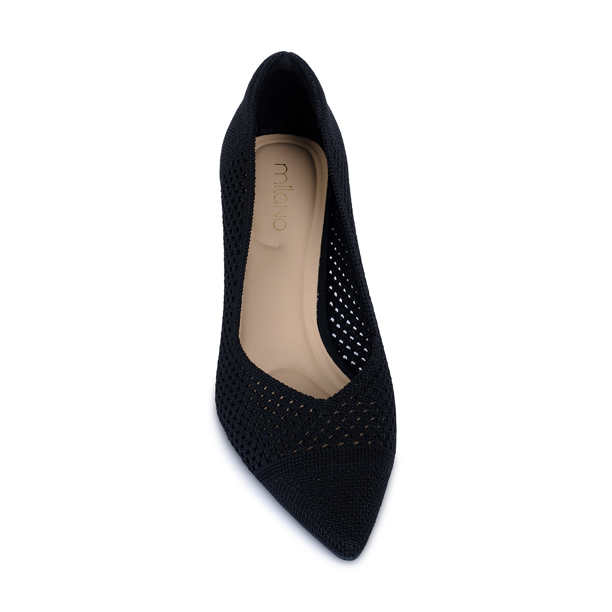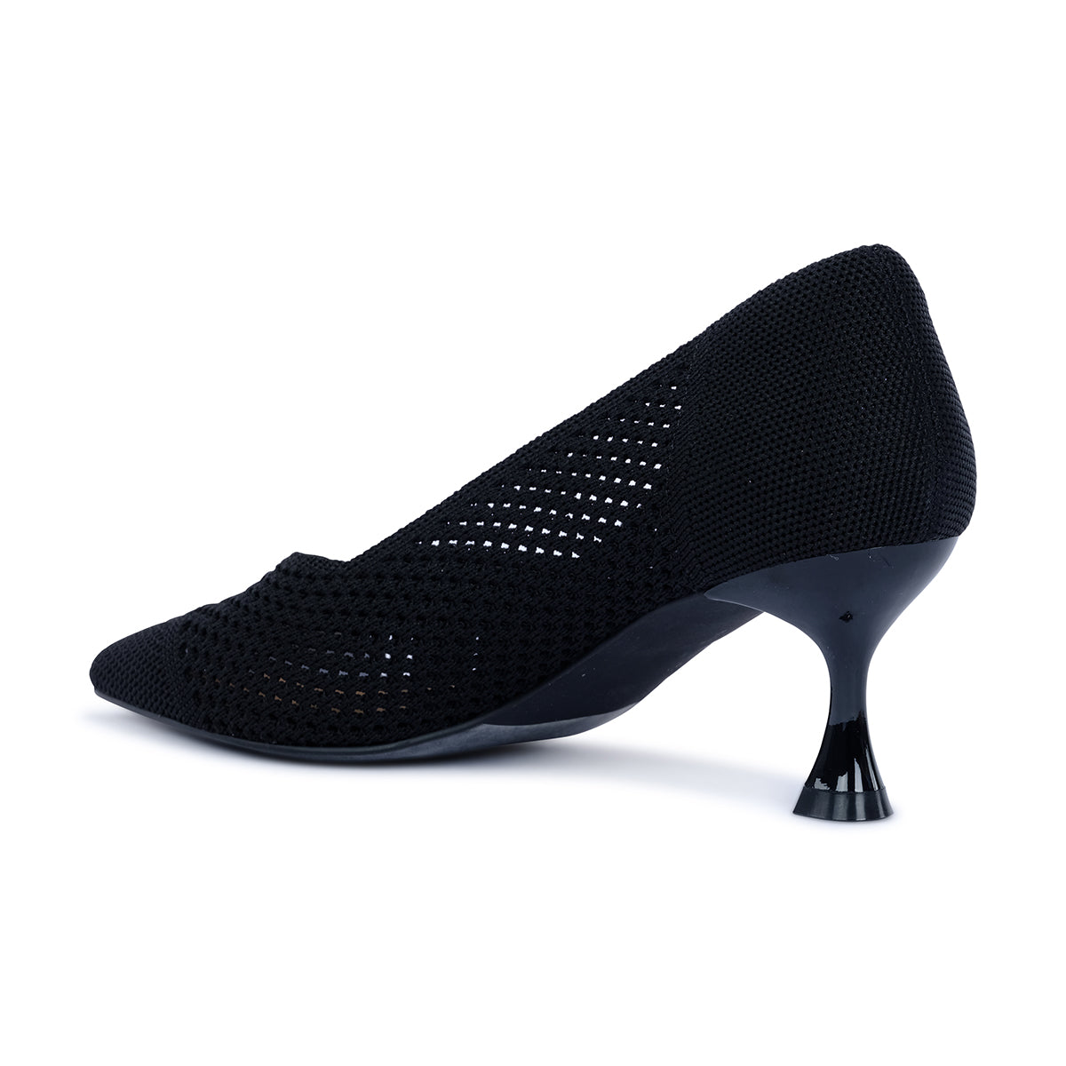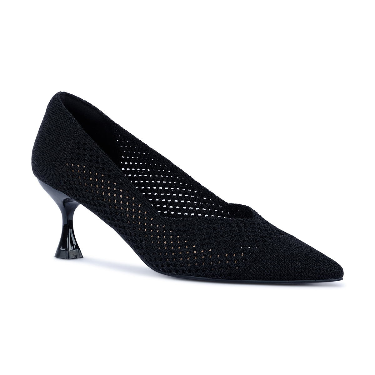 Chic black knit pumps with a pointed toe and sculpted heel. Features breathable mesh texture and a sleek, modern silhouette for refined elegance.