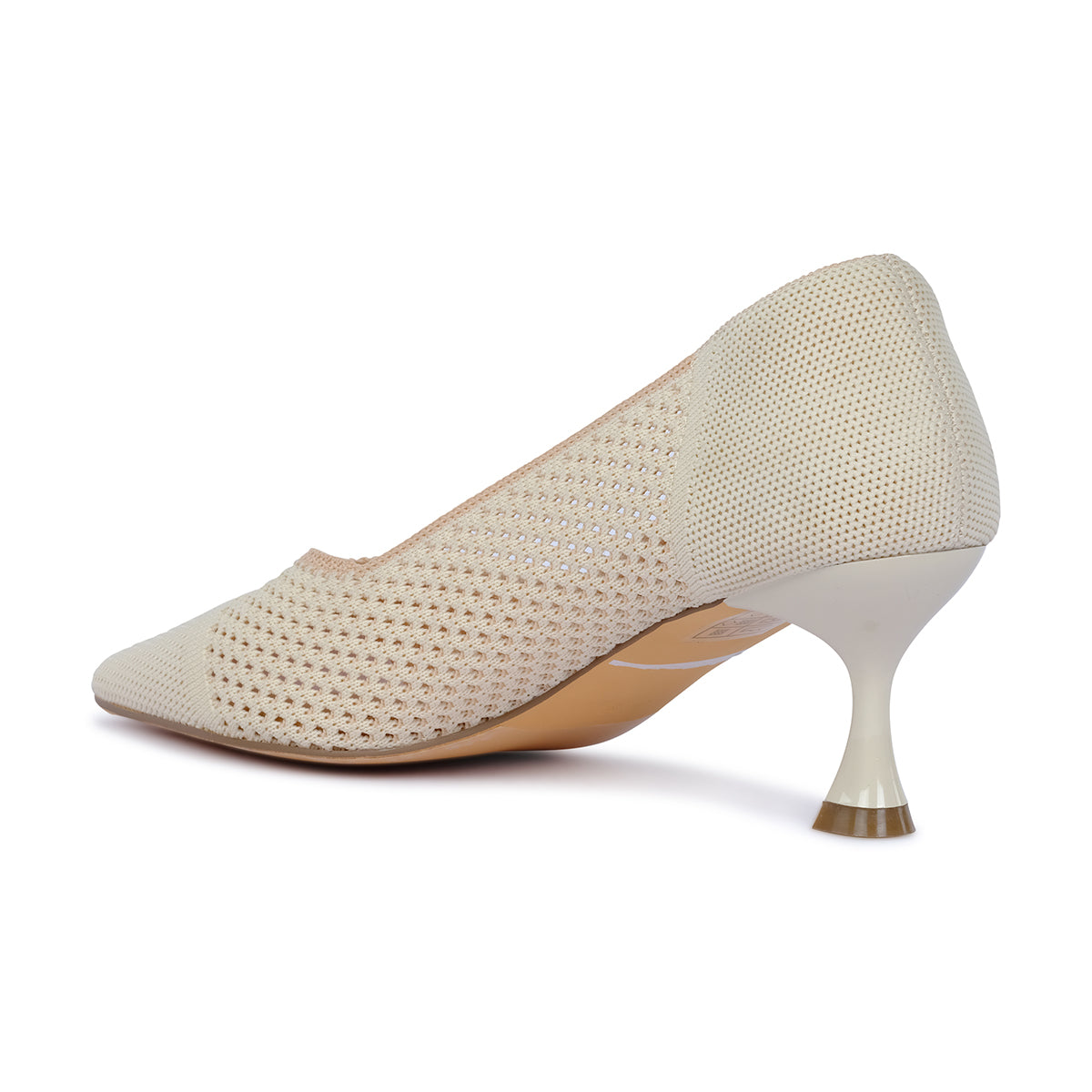 Chic beige knit pumps with a pointed toe and sculpted heel. Features breathable mesh texture and a sleek, modern silhouette for refined elegance.