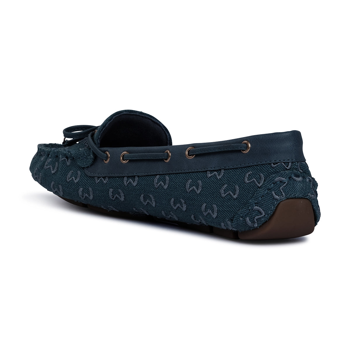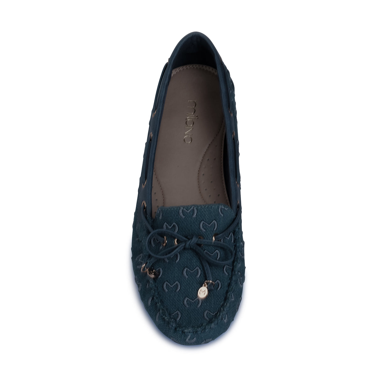 Elegant blue denim moccasin with embossed monogram detail, featuring a classic bow tie and gold-tone eyelets. A refined slip-on style blending comfort and sophistication.