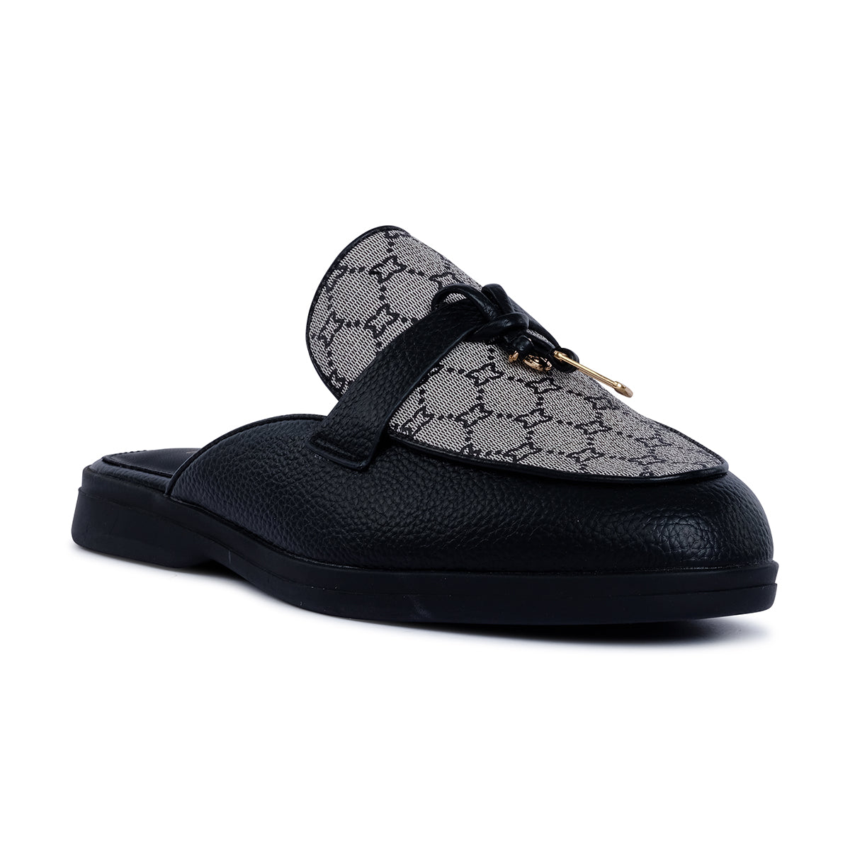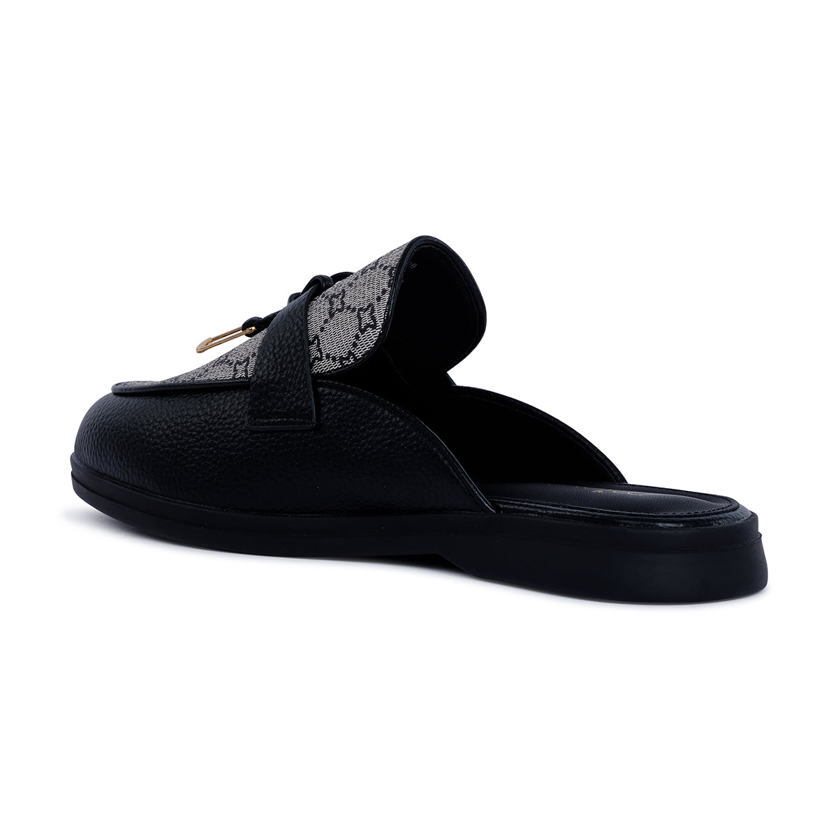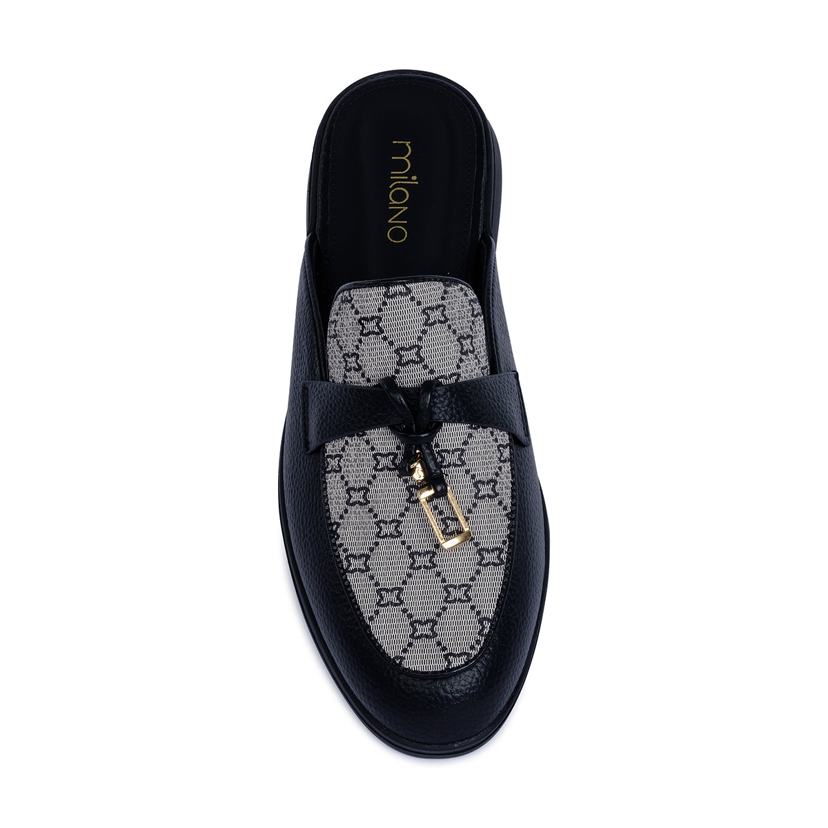 Modern black slip-on mule with monogram fabric vamp and smooth trim. Finished with a chic gold-tone charm for a touch of understated luxury
