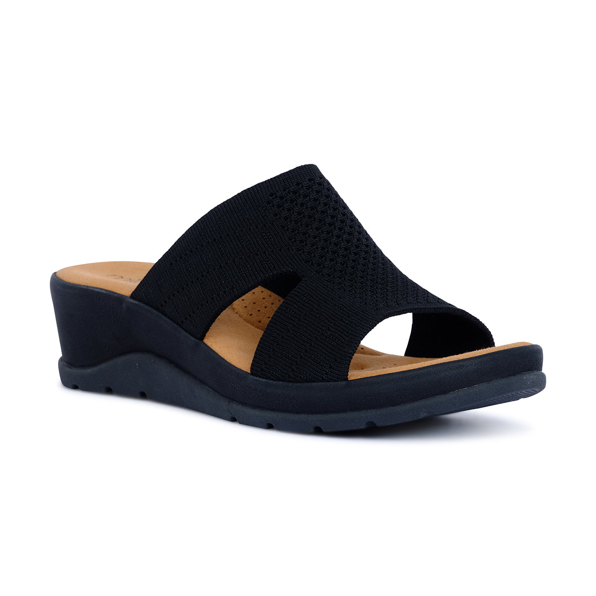 Contemporary black wedge slide with cutout knit straps and cushioned footbed. Lightweight design combines comfort and modern style for effortless everyday wear.