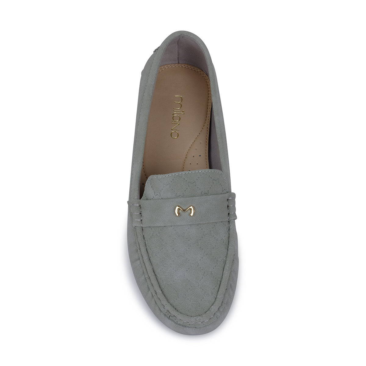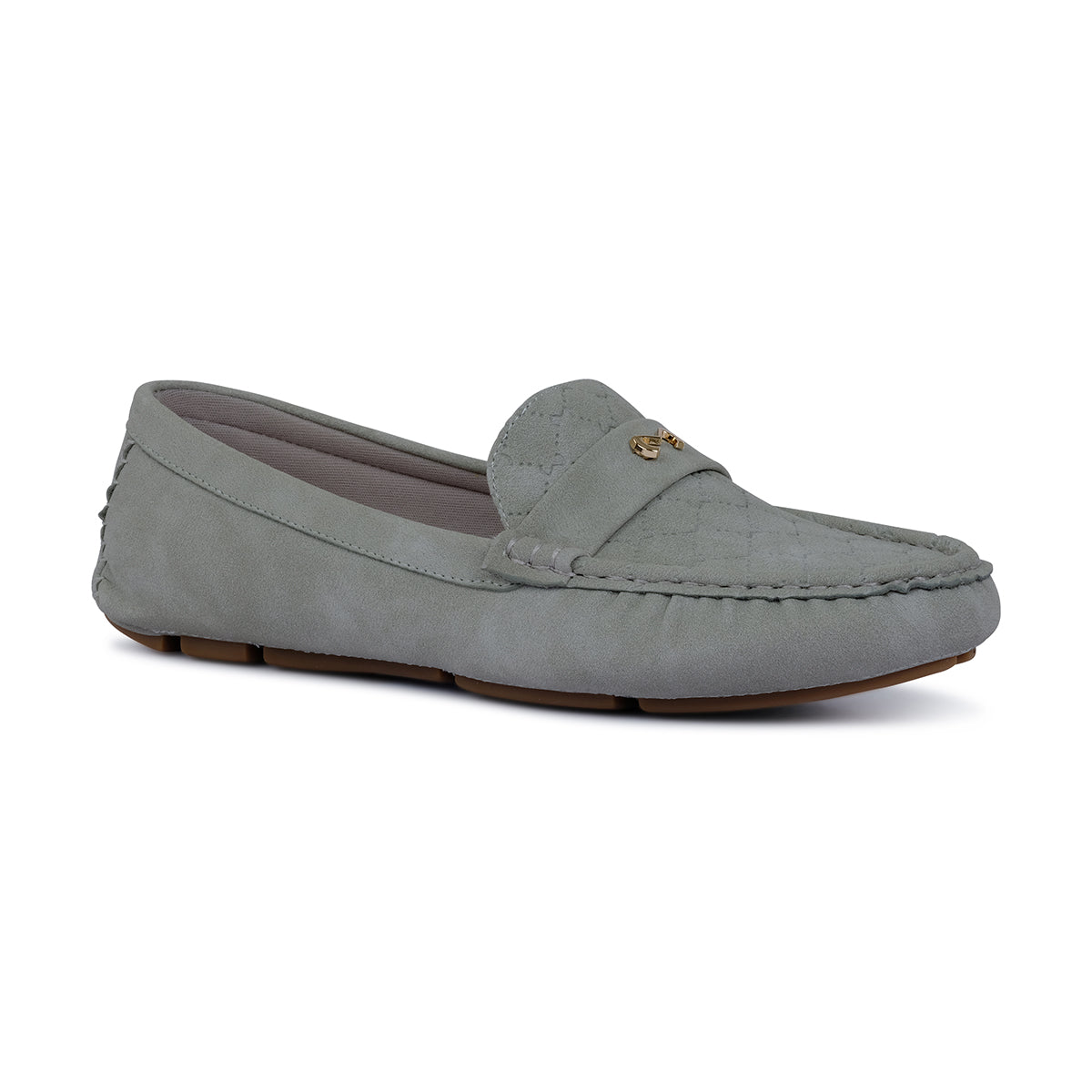 Classic grey moccasin, featuring a sleek moc toe and signature metal accent. Designed for timeless sophistication with all-day comfort.